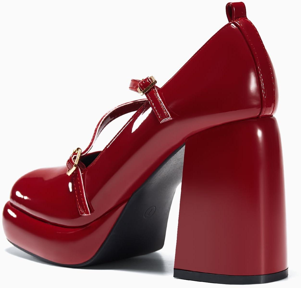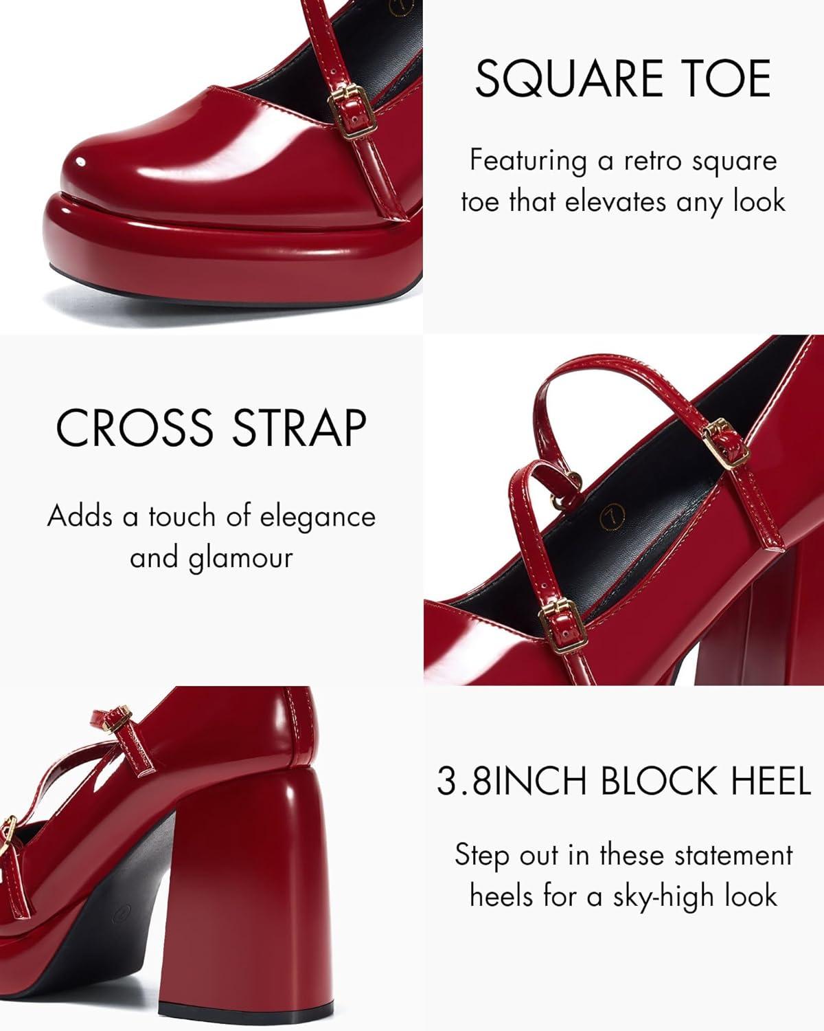 Coutgo Womens Mary Jane Heels Chunky Platform Loafer Shoes Block Heel Closed Square Toe Pumps Cross Strap High Heel Dress Shoes(Red)