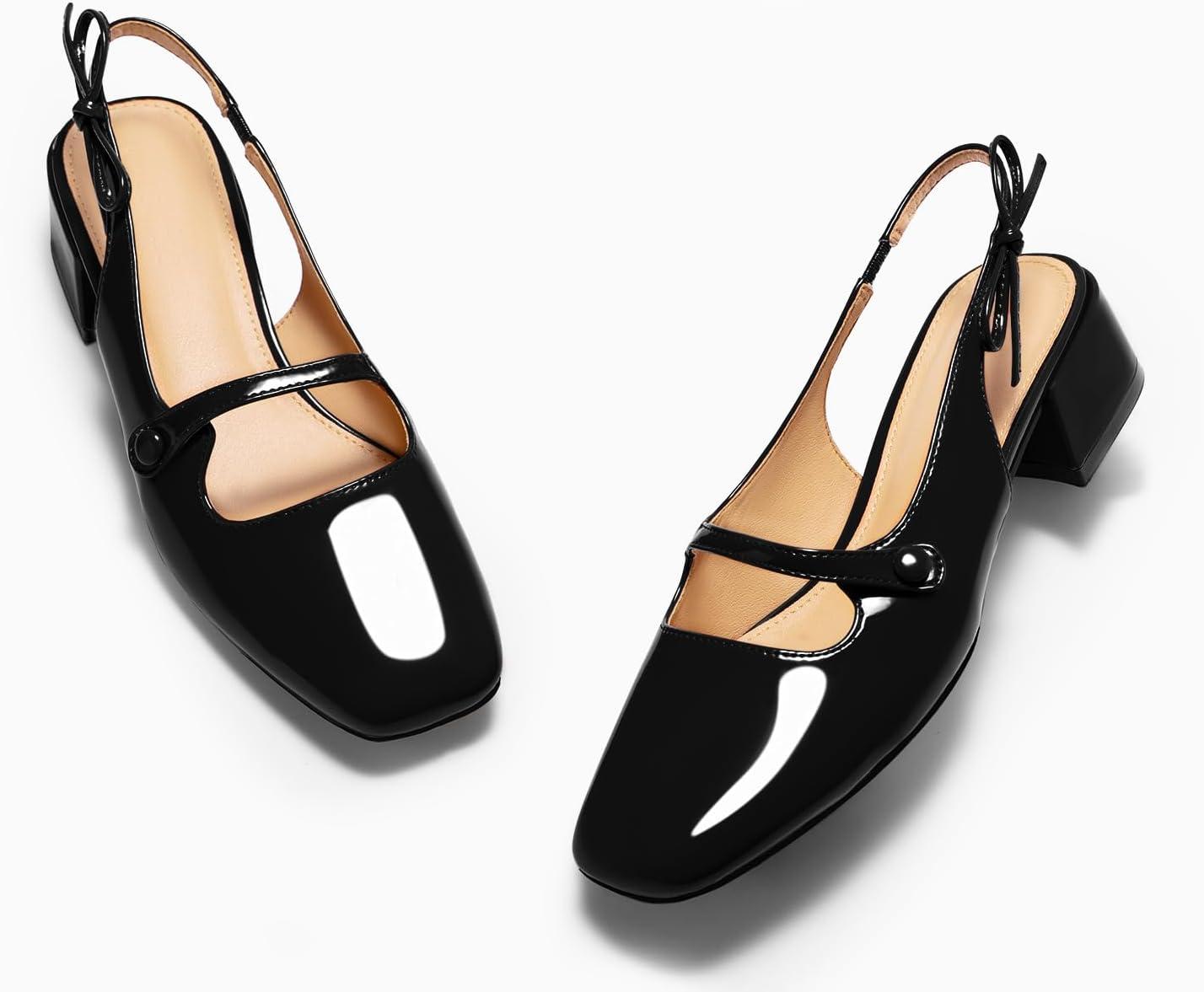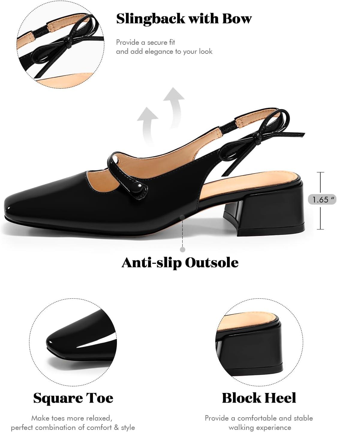 Coutgo Womens Mary Jane Shoes Slingback Chunky Low Heels Bow Closed Square Toe Pumps Wedding Party Dress Shoes(Black)