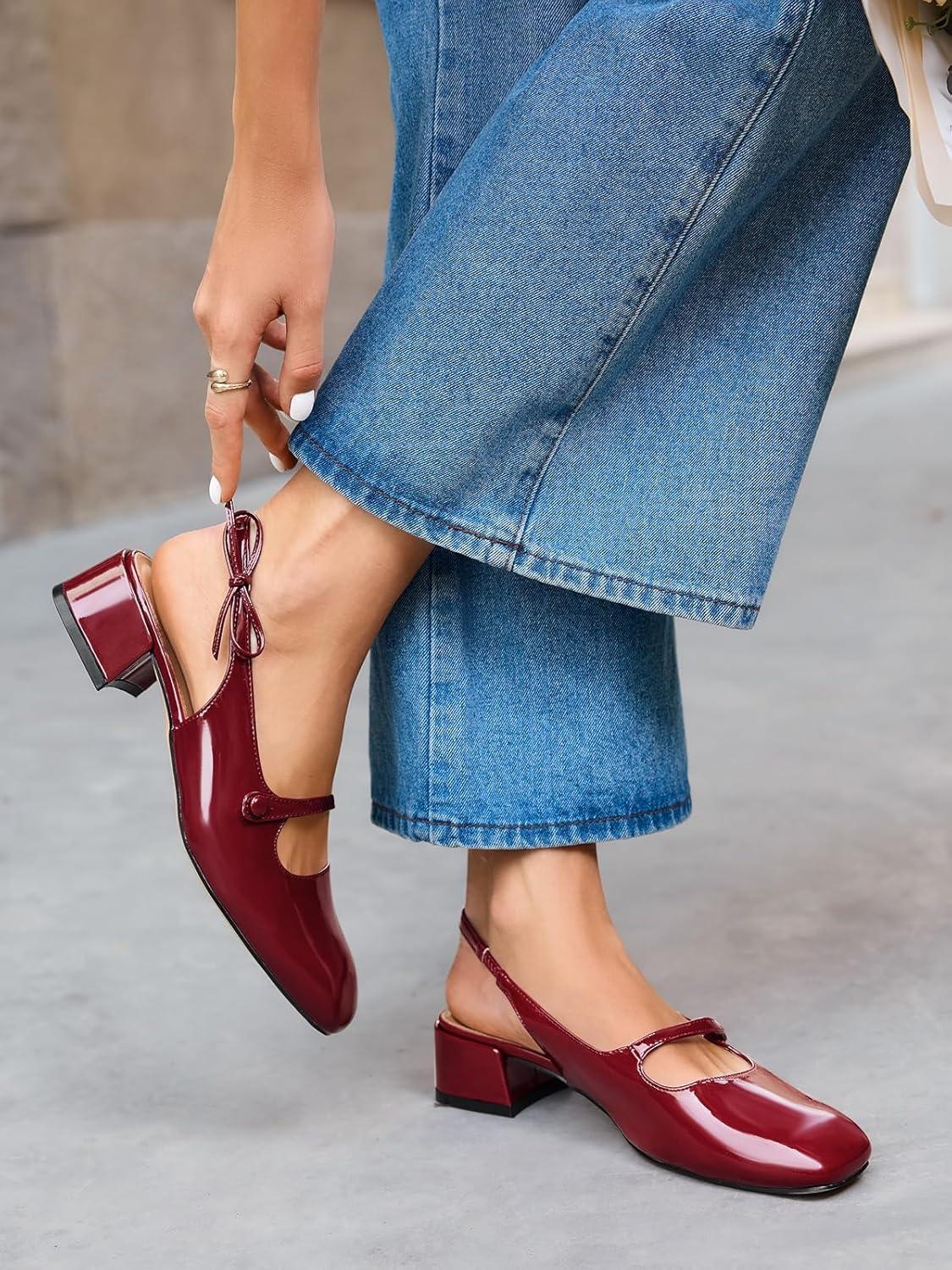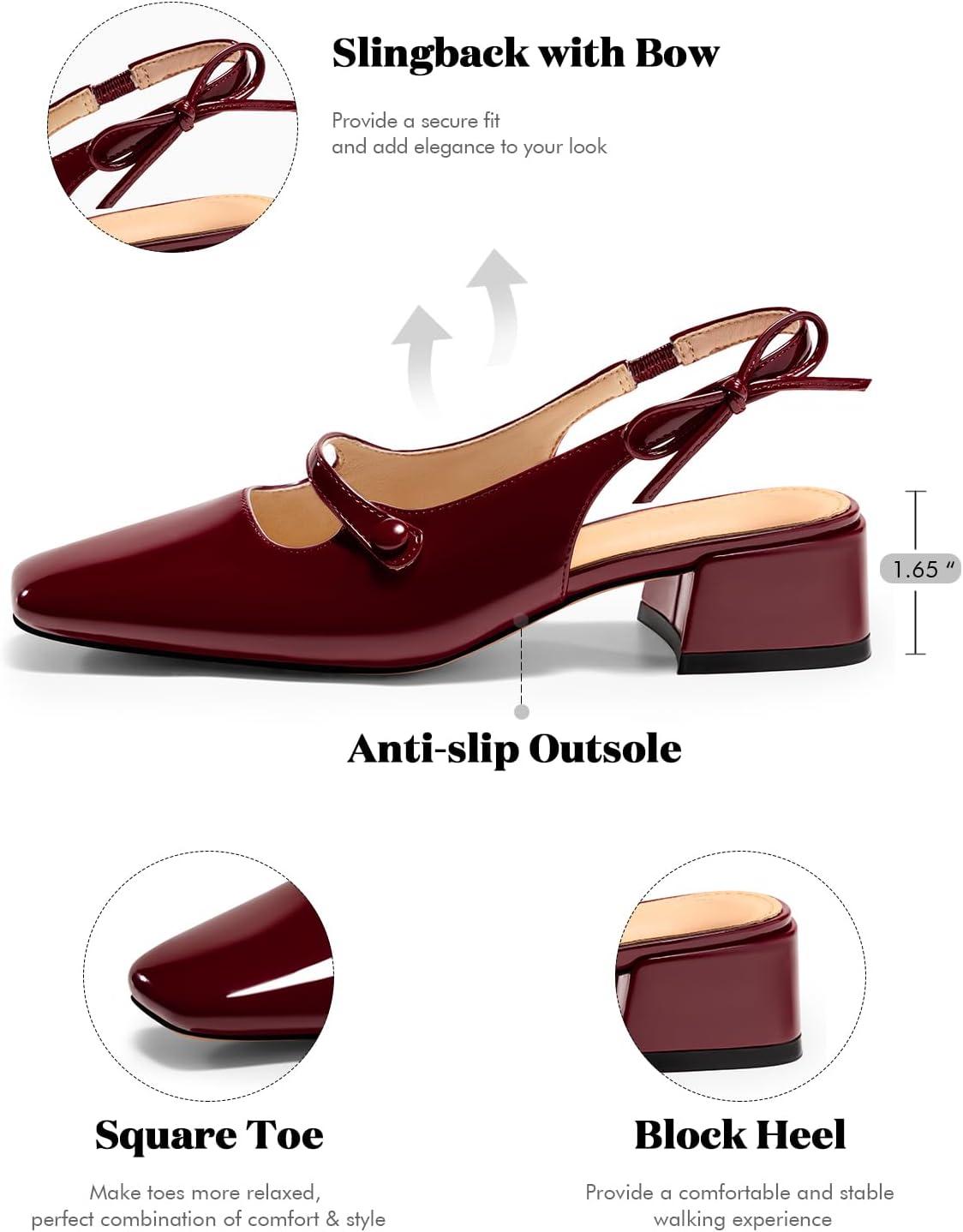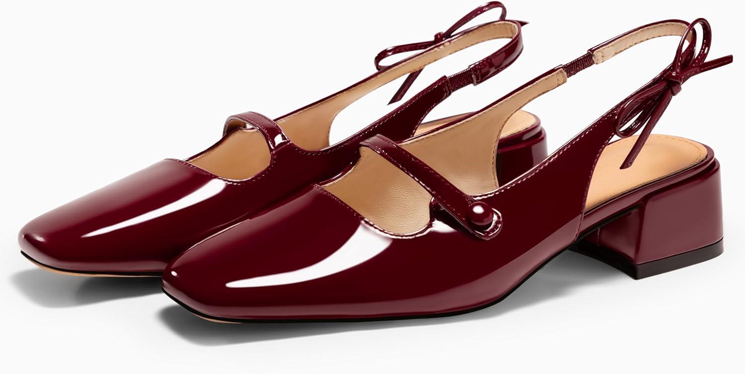 Coutgo Womens Mary Jane Shoes Slingback Chunky Low Heels Bow Closed Square Toe Pumps Wedding Party Dress Shoes(Burgundy)