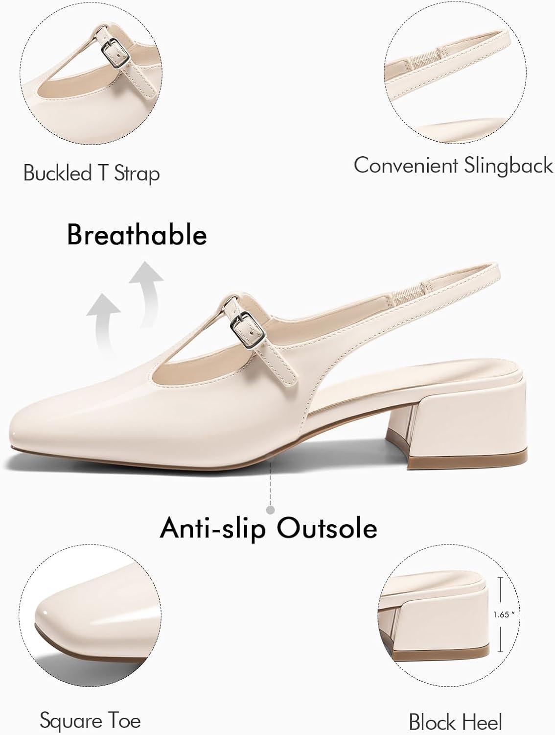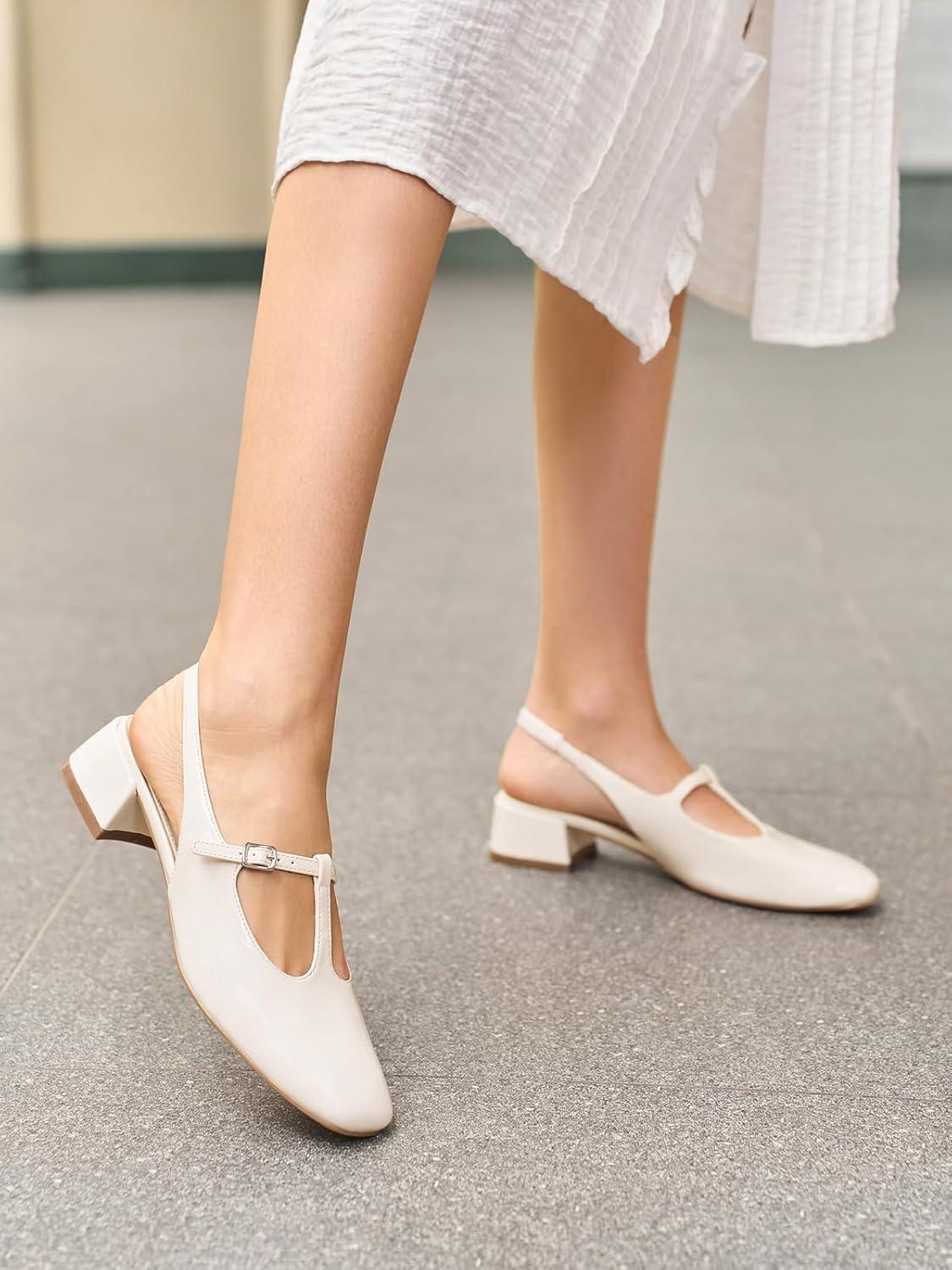 Coutgo Womens Mary Jane Slingback Low Heels T Strap Chunky Heel Closed Toe Pumps Wedding Party Dress Shoes(Beige)