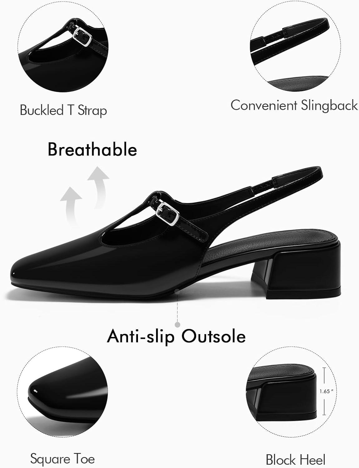 Coutgo Womens Mary Jane Slingback Low Heels T Strap Chunky Heel Closed Toe Pumps Wedding Party Dress Shoes(Black)