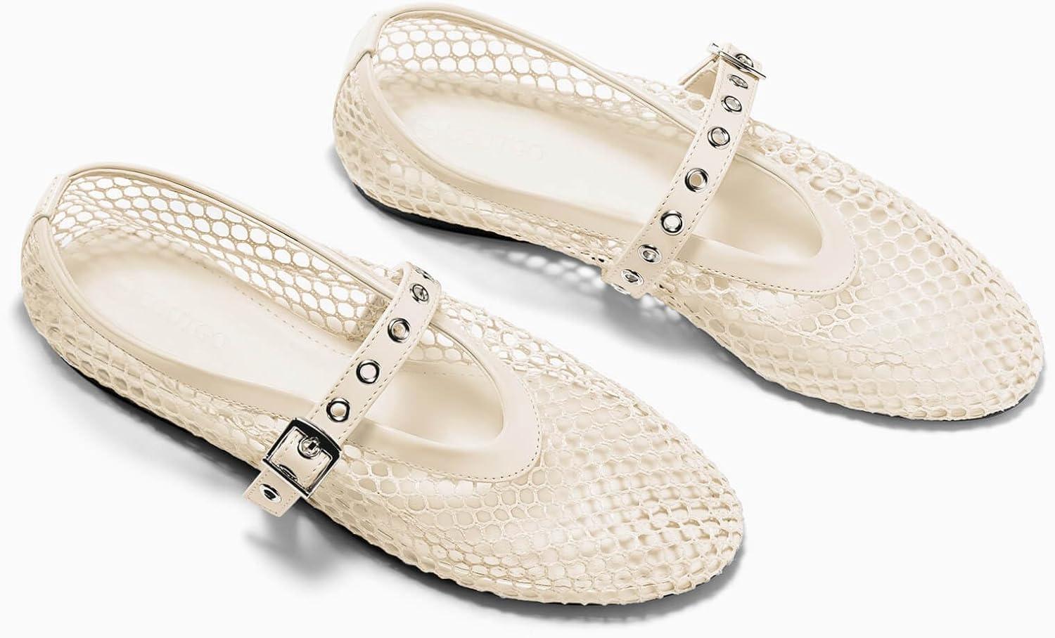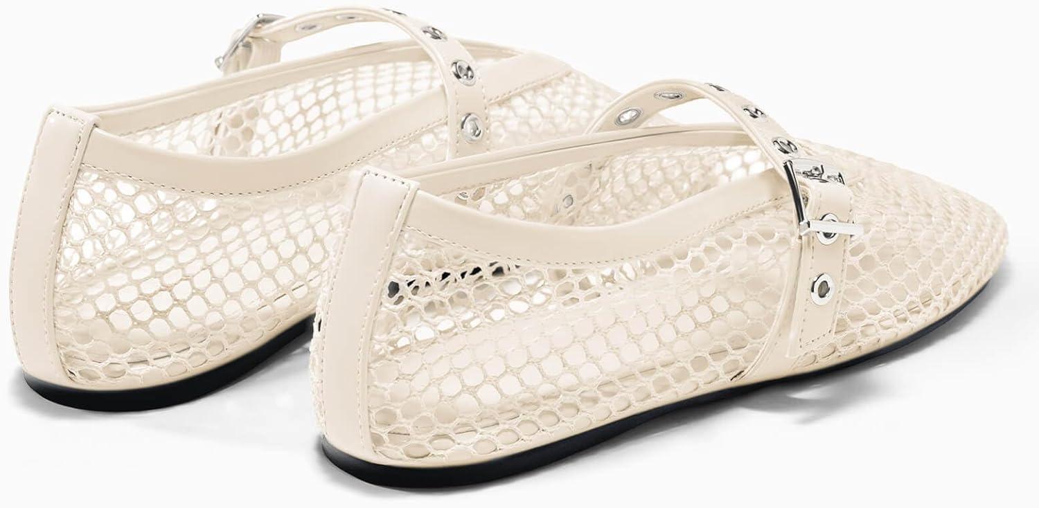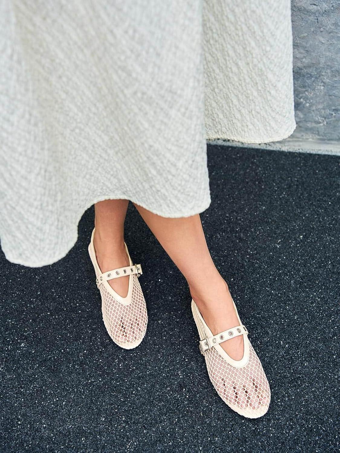 Coutgo Womens Mesh Ballet Flats Mary Jane Fishnet Ballerina Buckle Strap Comfortable Causal Dress Shoes(Apricot)