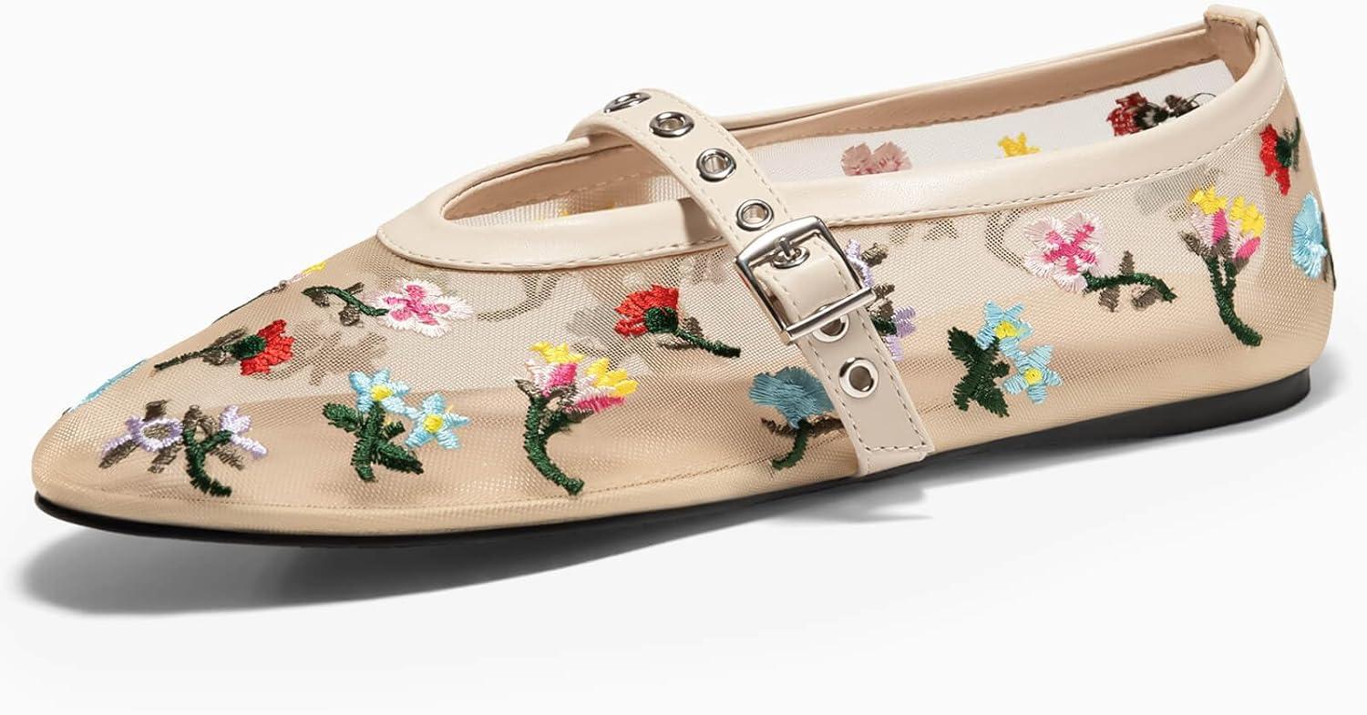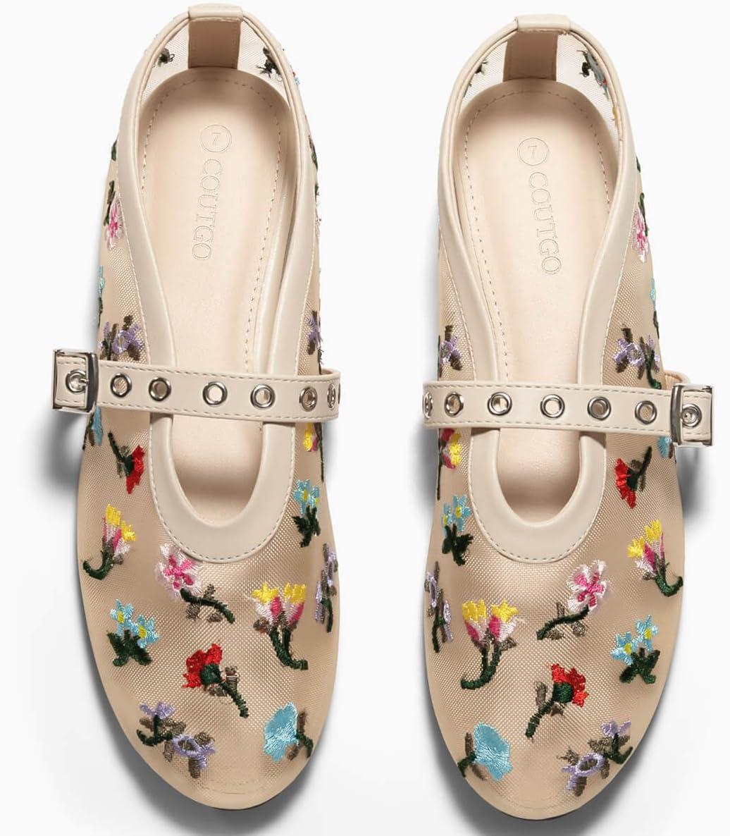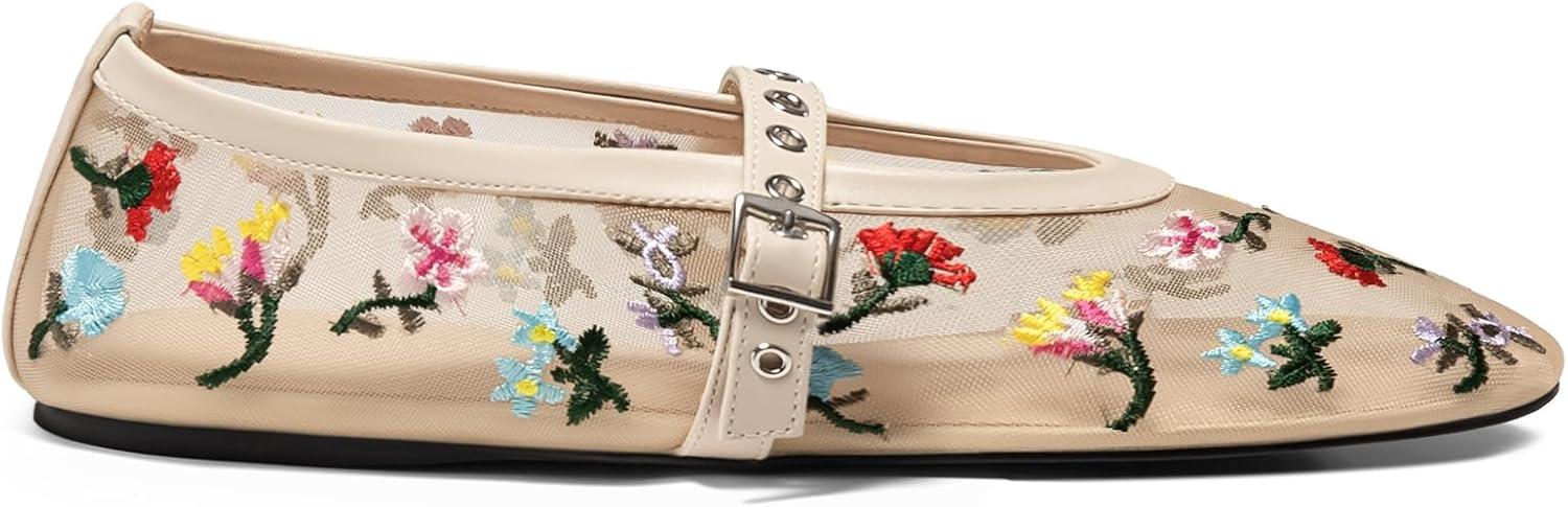 Coutgo Womens Mesh Ballet Flats Mary Jane Fishnet Ballerina Buckle Strap Comfortable Causal Dress Shoes(Khaki)