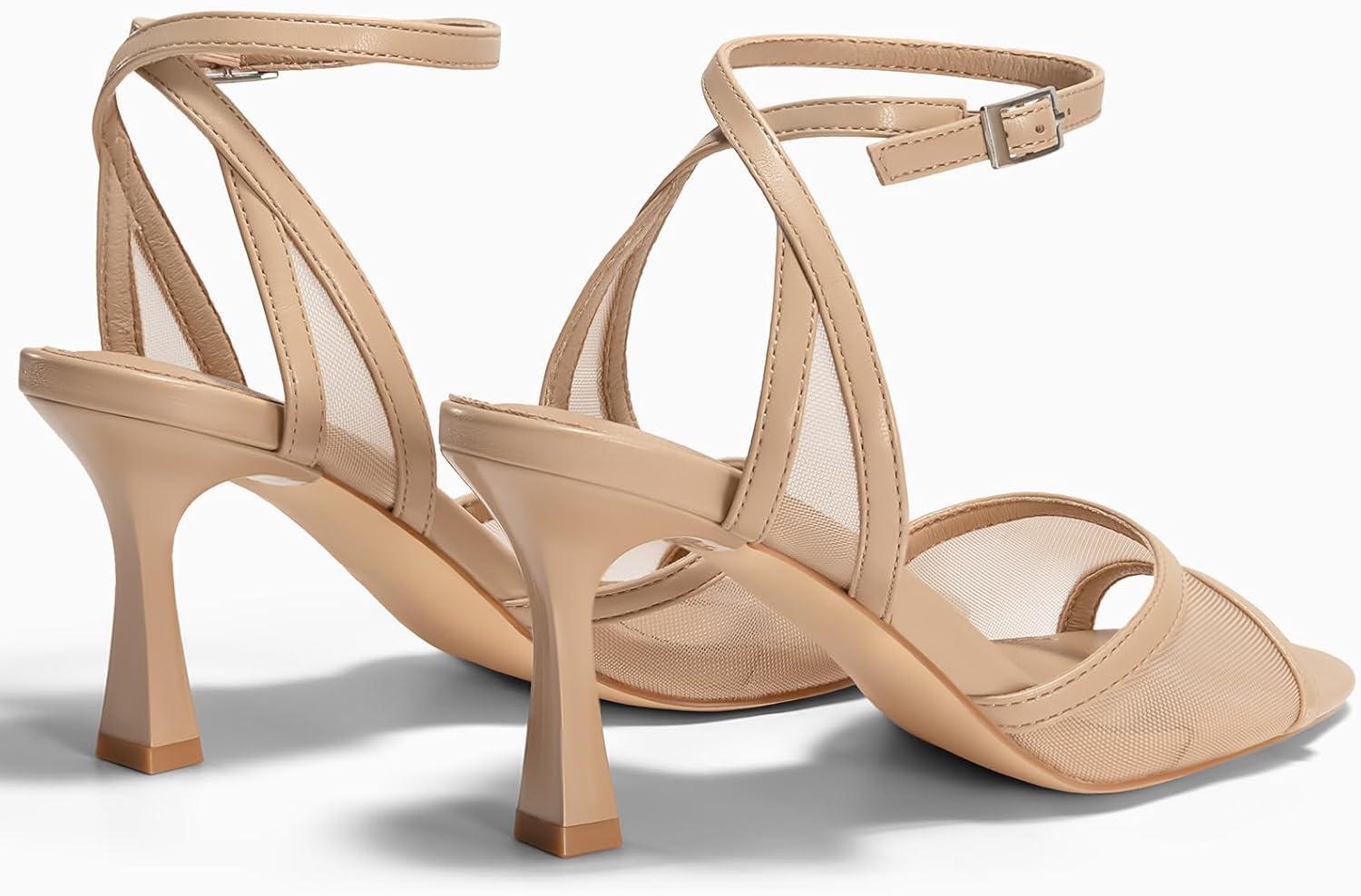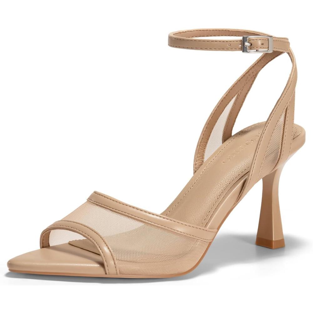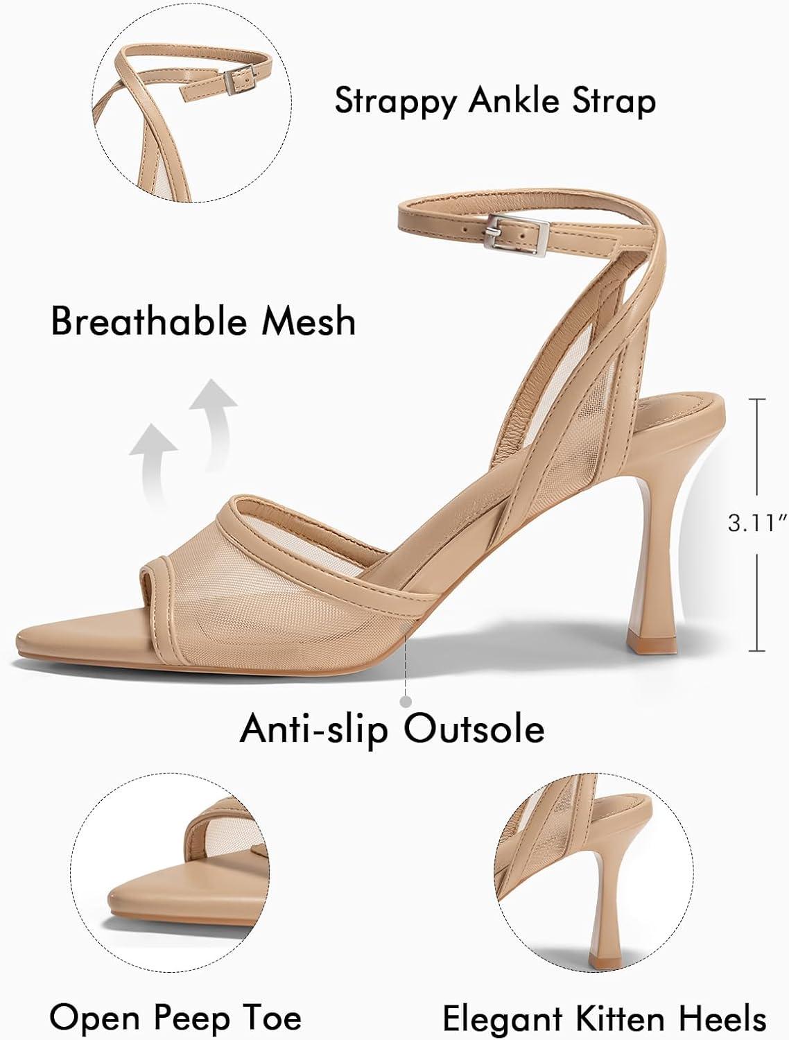 Coutgo Womens Mesh Kitten Heels Sandals Pointed Open Toe Ankle Buckle Strap Summer Dress Shoes(Khaki)