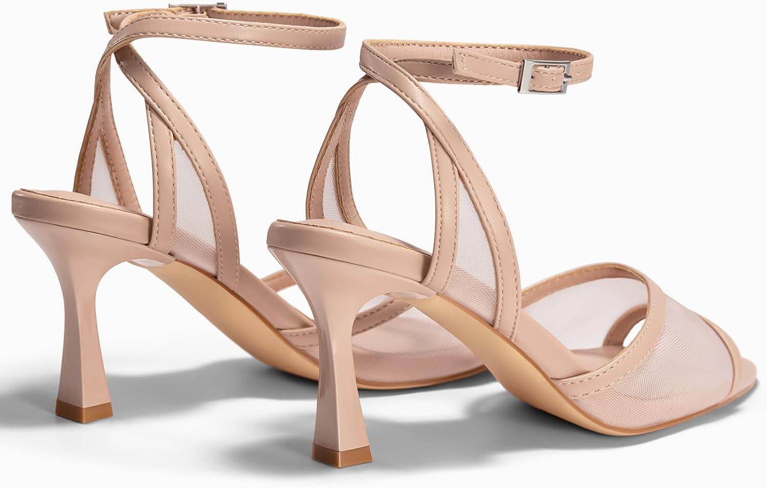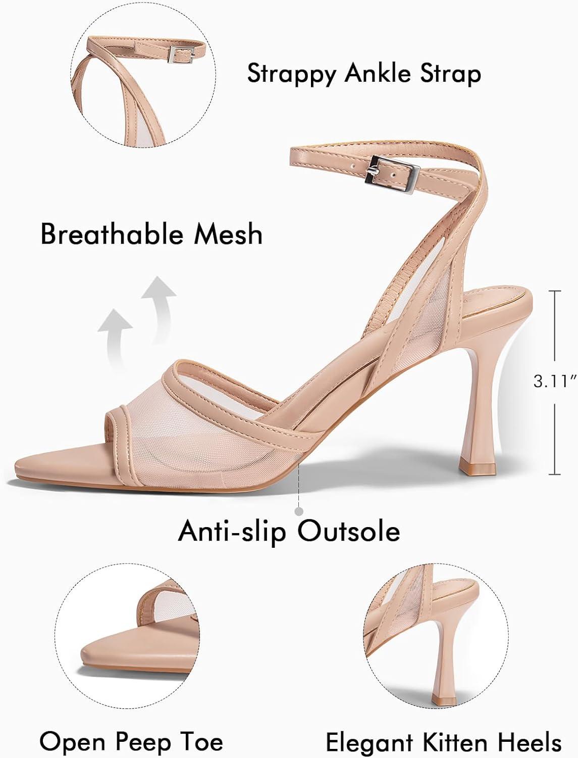 Coutgo Womens Mesh Kitten Heels Sandals Pointed Open Toe Ankle Buckle Strap Summer Dress Shoes(Light Pink)