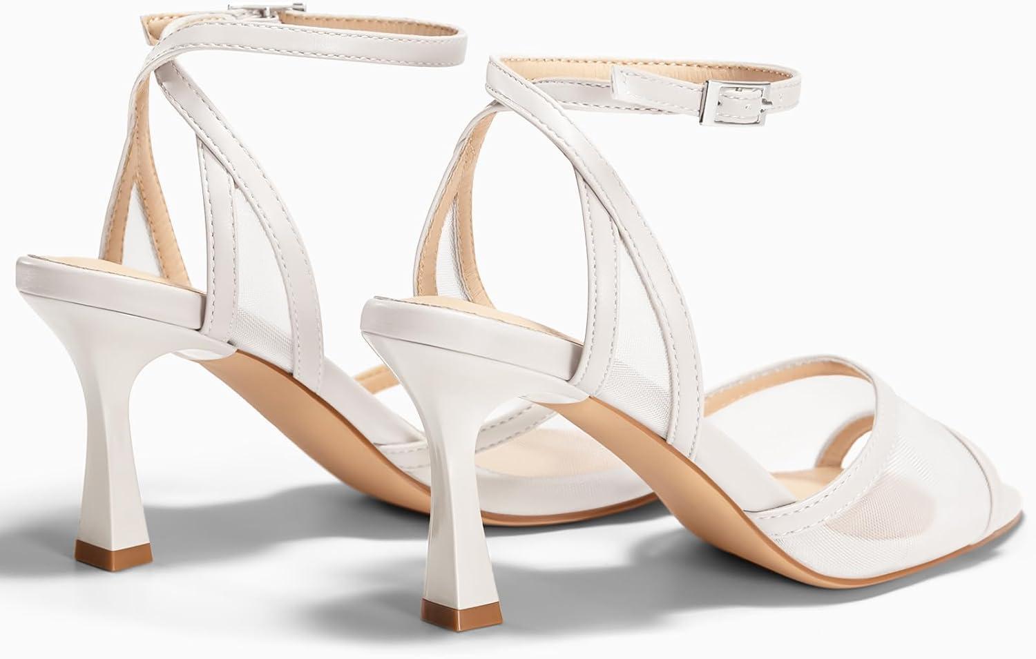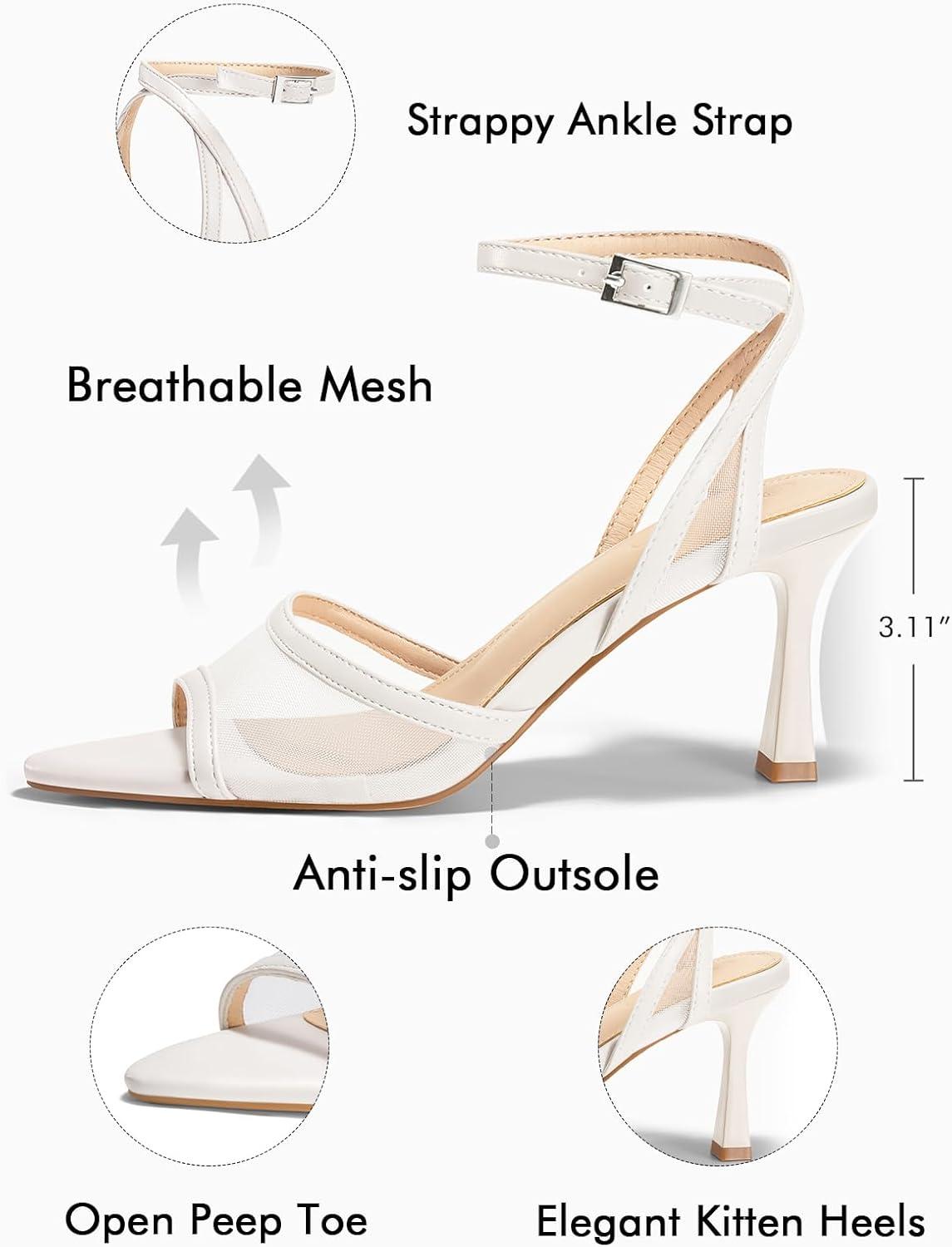 Coutgo Womens Mesh Kitten Heels Sandals Pointed Open Toe Ankle Buckle Strap Summer Dress Shoes(White)