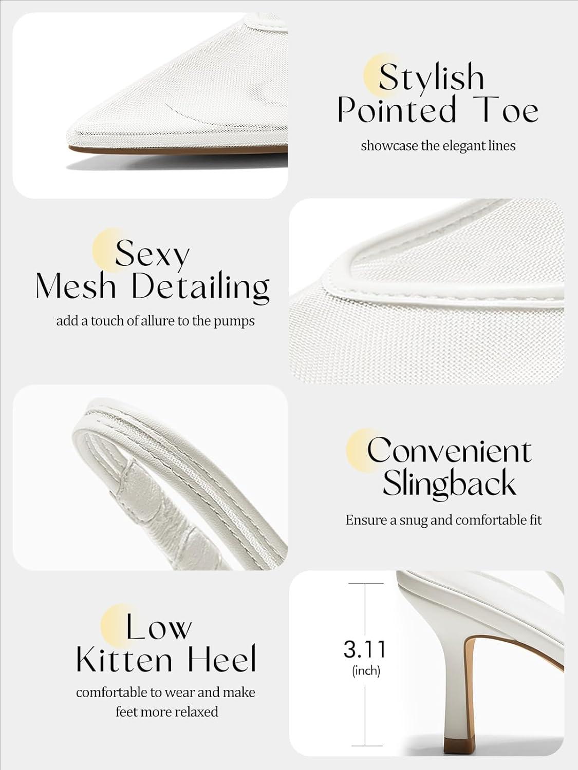 Coutgo Womens Mesh Slingback Kitten Heels Pointed Toe Low Heel Pumps Sexy Dress Shoes(White)