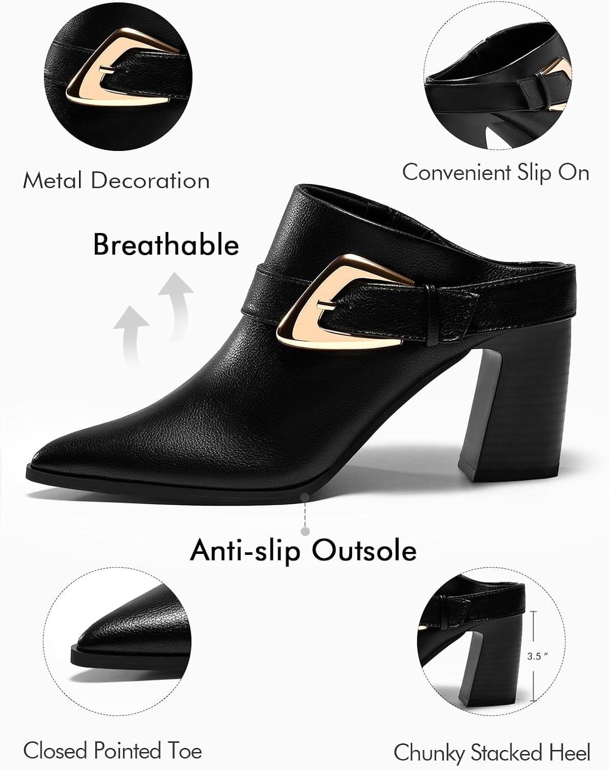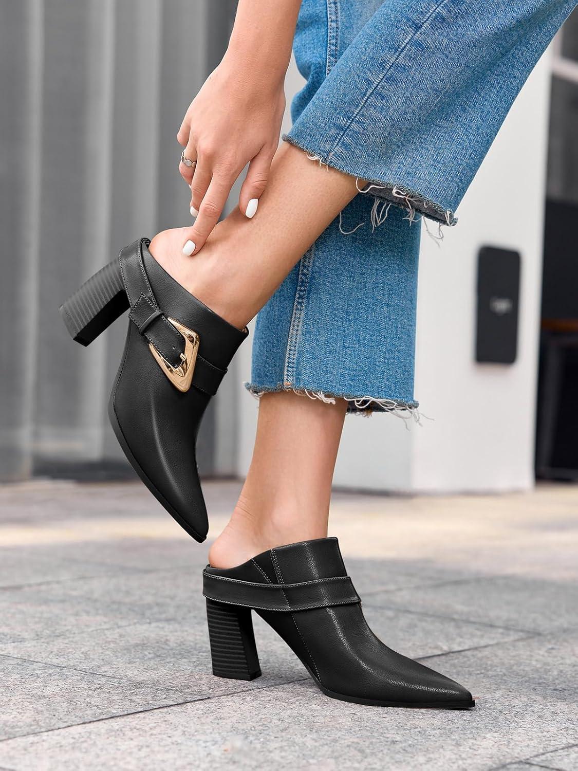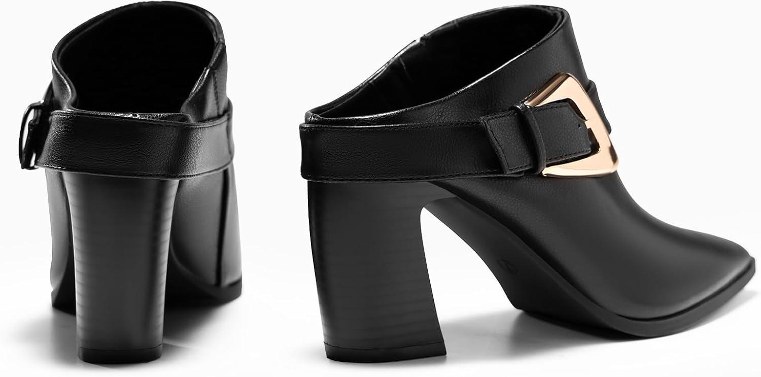 Coutgo Womens Mules Boots Chunky Stacked Heel Pointed Toe Booties Slip On Dress Boot Shoes with Buckle Decoration(Black)