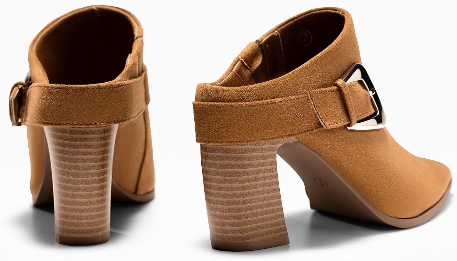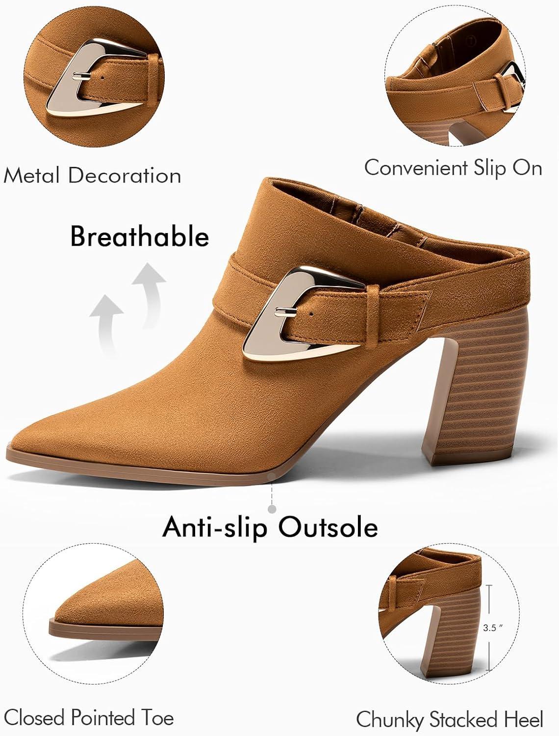 Get your hands on our newest Coutgo Womens Mules Boots Chunky Stacked Heel Pointed Toe Booties Slip On Dress Boot Shoes with Buckle Decoration(Suede Brown) and enjoy a limited-time discount offer.
