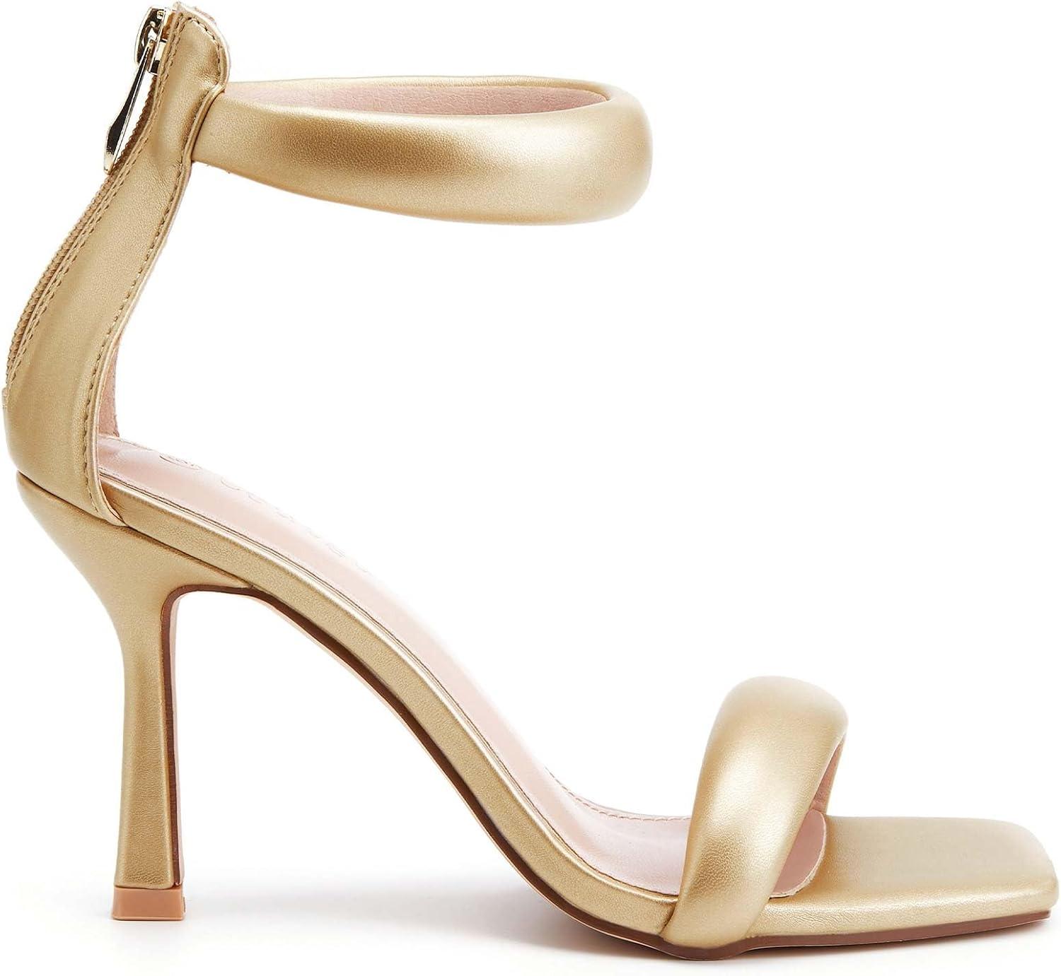 Coutgo Women’s One Strap Heeled Sandals Square Open Toe Stiletto Heels Ankle Buckle Strap Summer Pump Shoes(Gold)