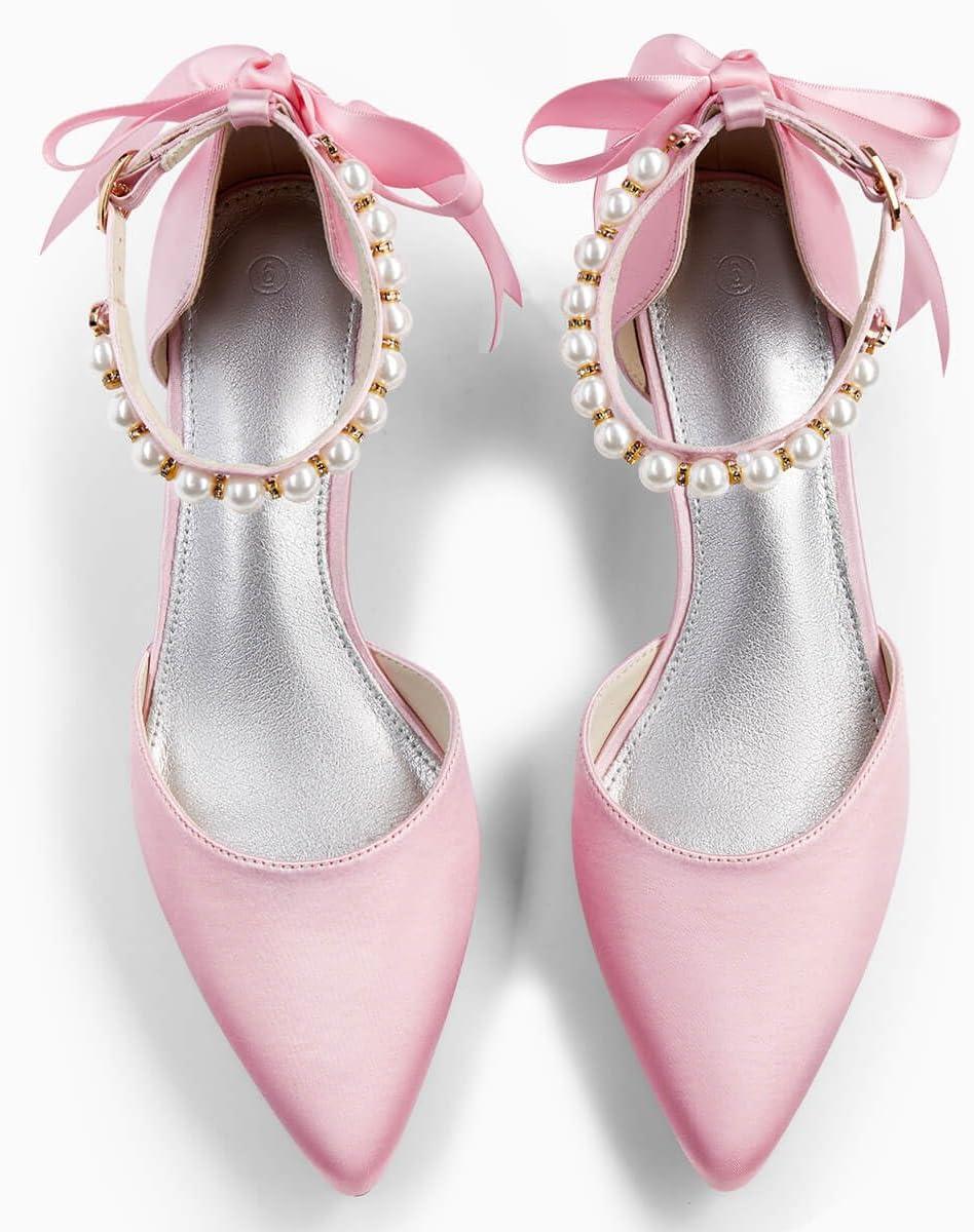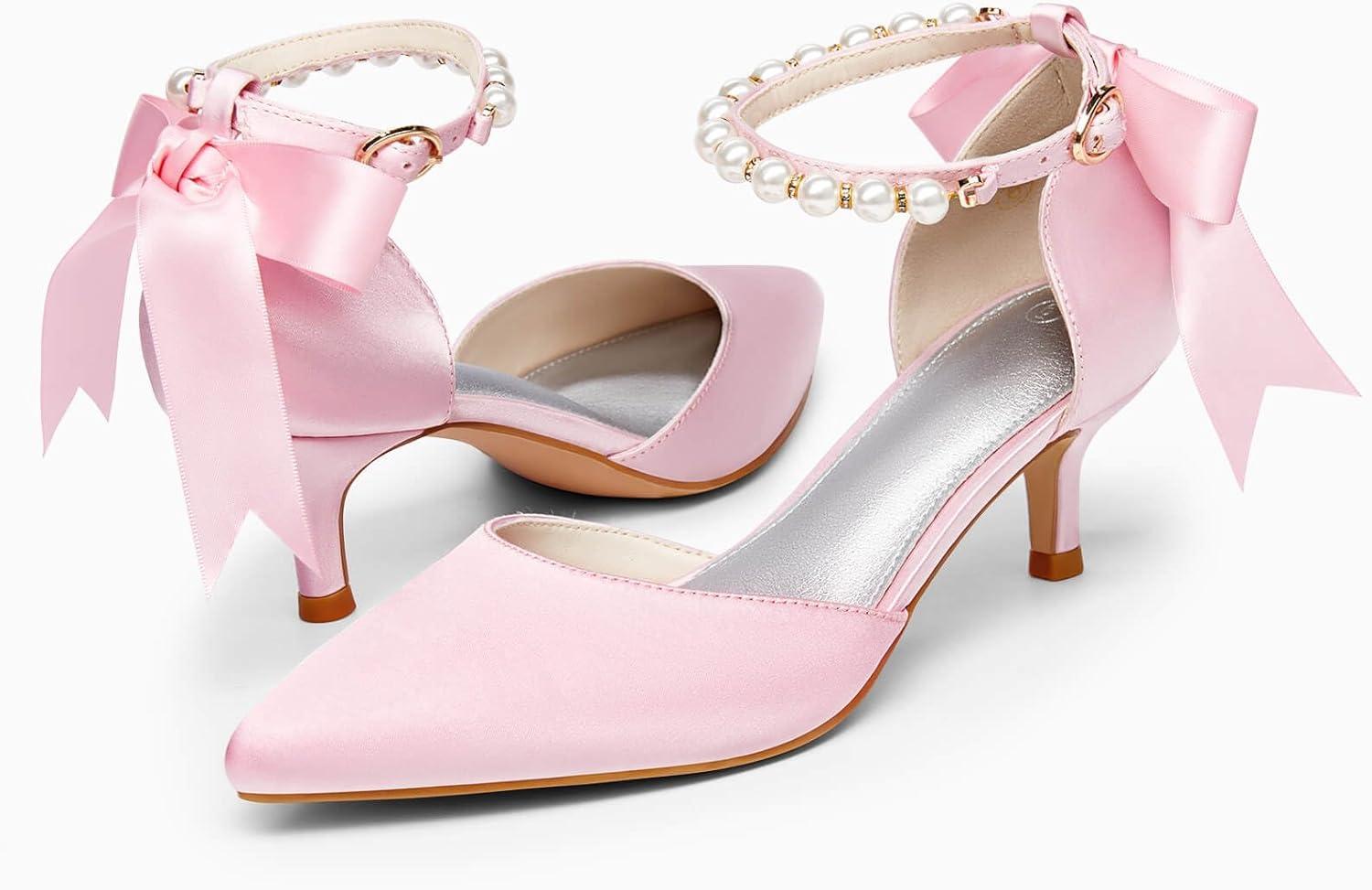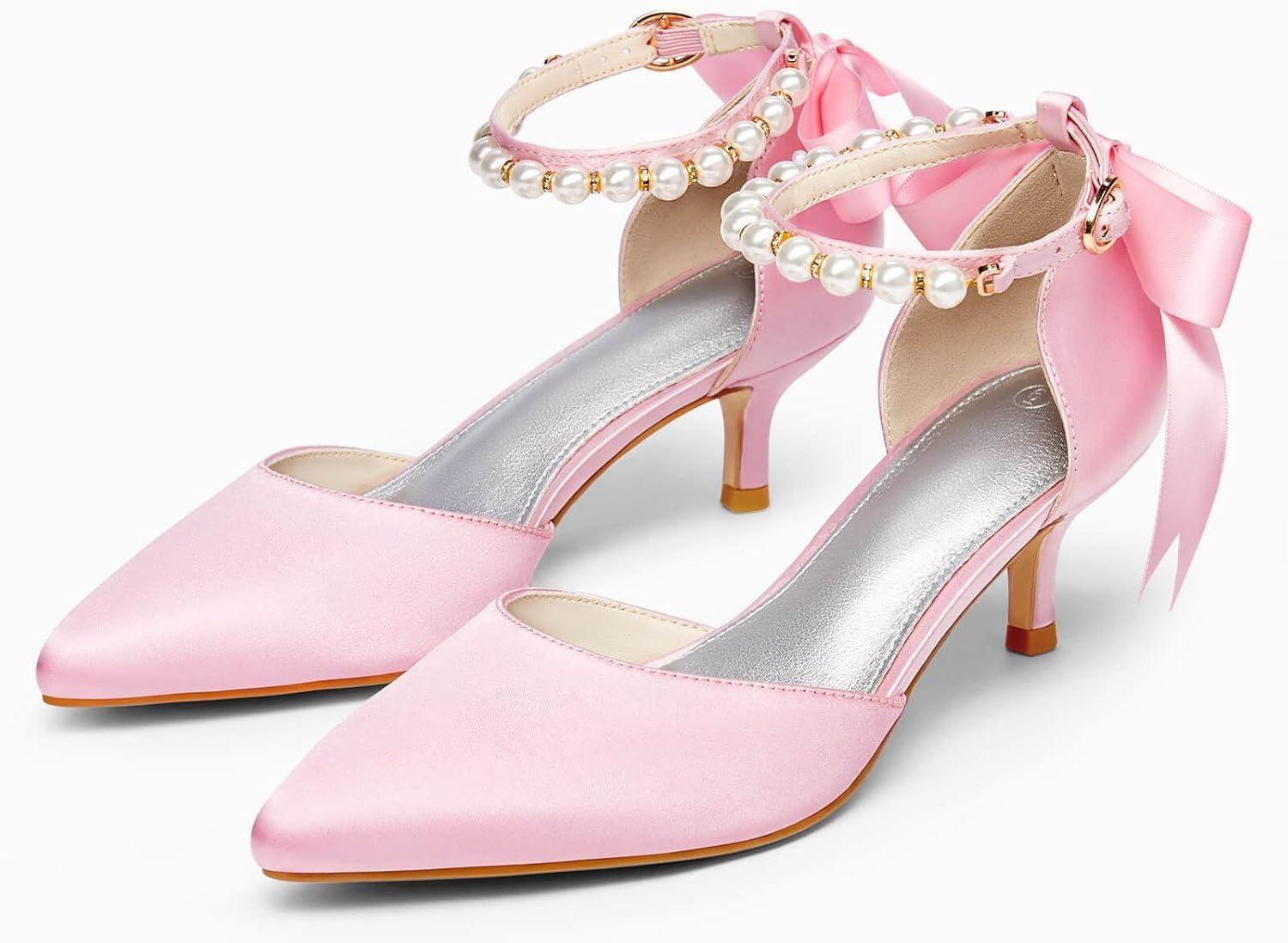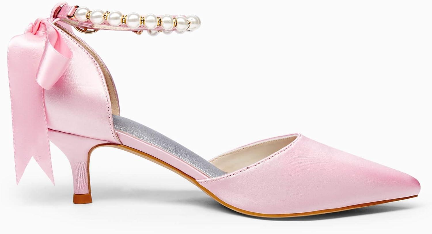 Coutgo Womens Pearl Ankle Strap Pumps Low Kitten Heel D’Orsay Satin Back Tieknot Heels Pointed Toe Wedding Party Dress Shoes(Pink)