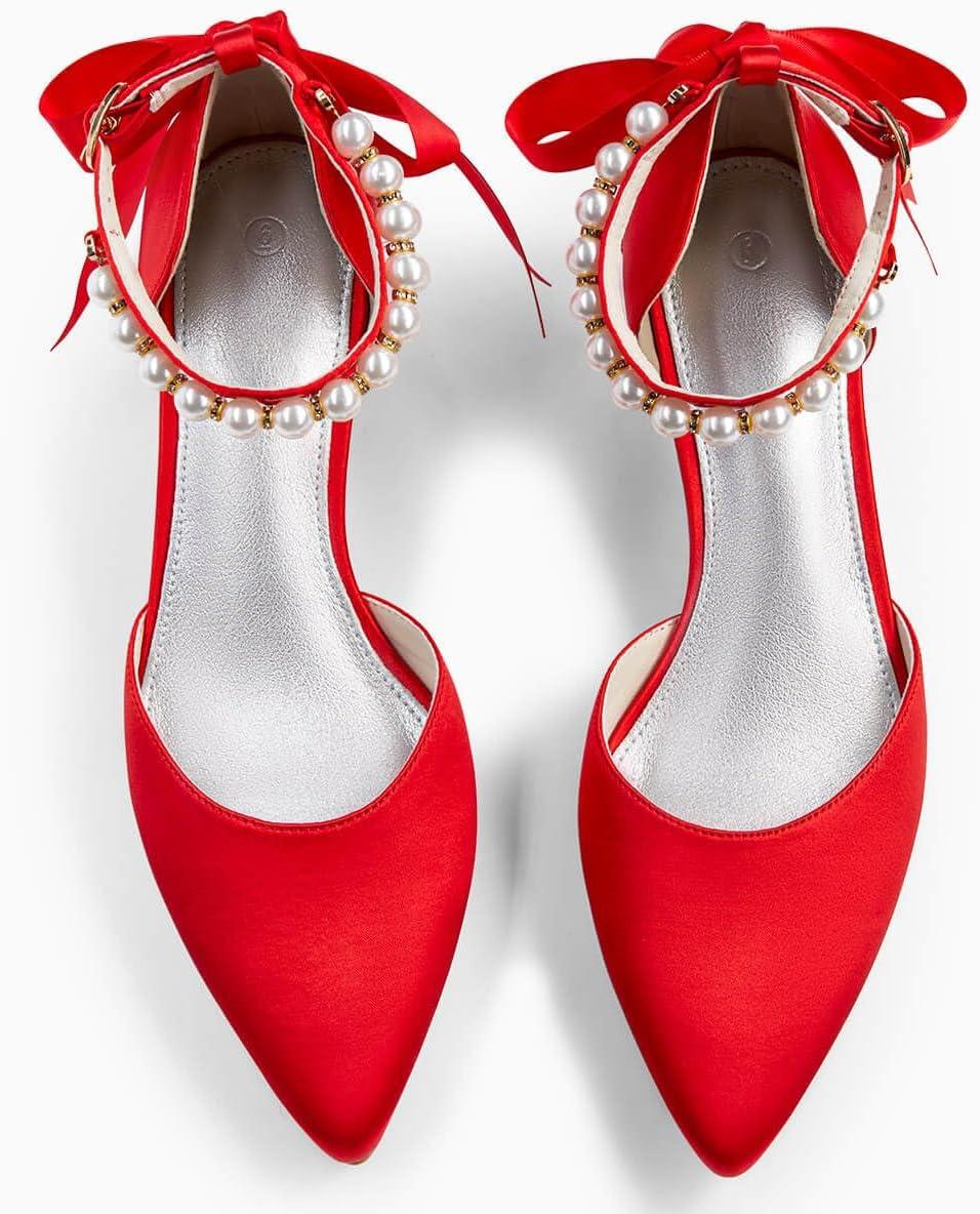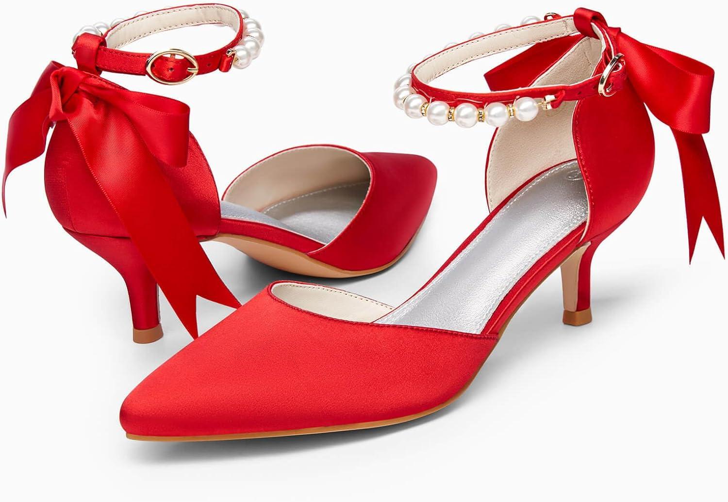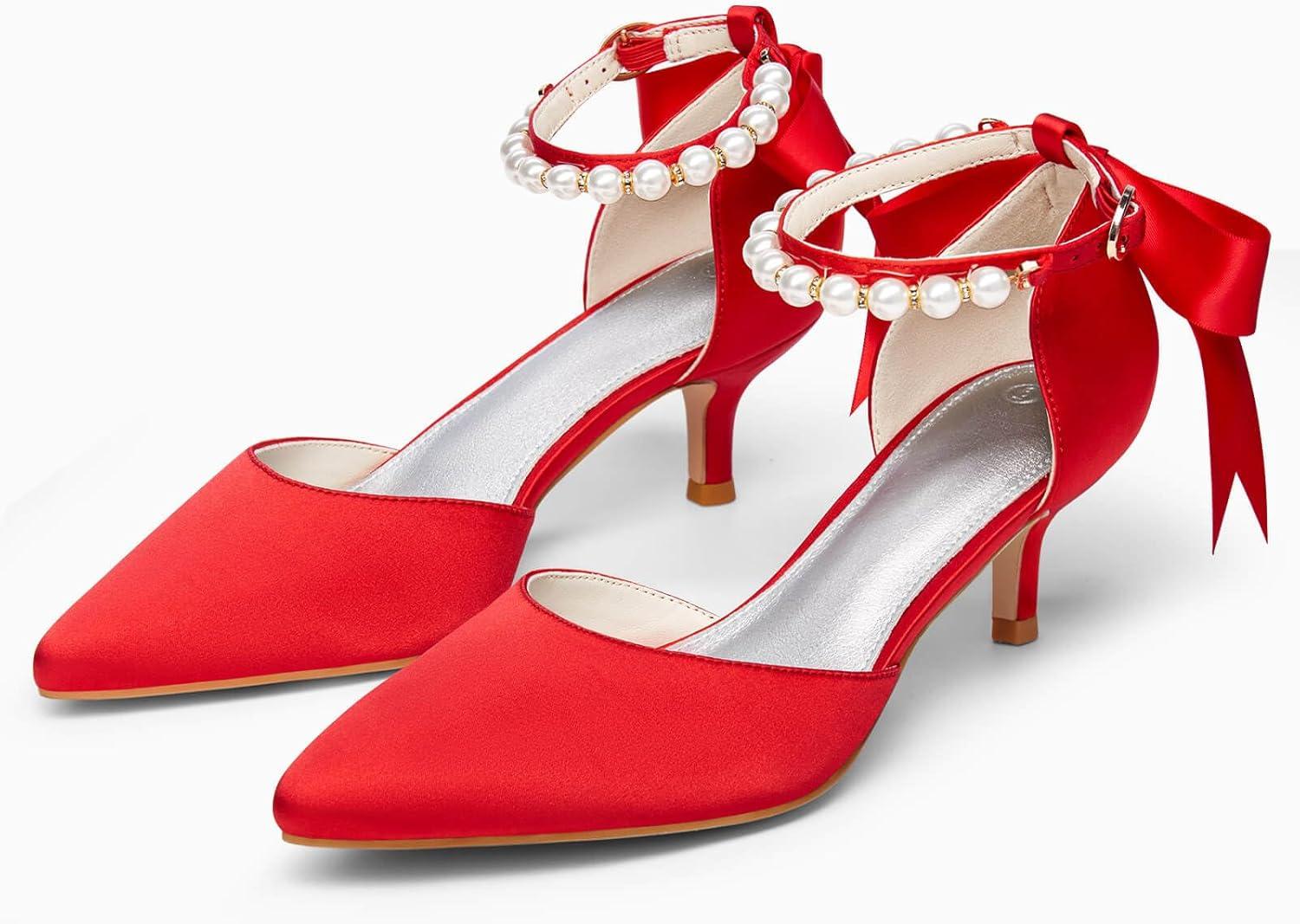 Coutgo Womens Pearl Ankle Strap Pumps Low Kitten Heel D’Orsay Satin Back Tieknot Heels Pointed Toe Wedding Party Dress Shoes(Red)