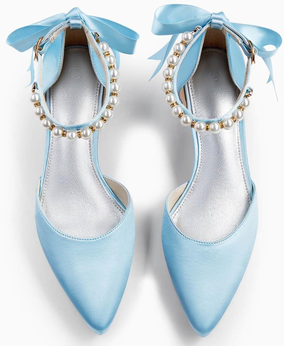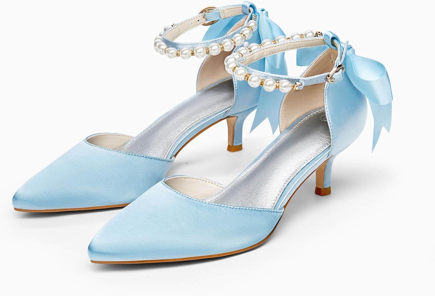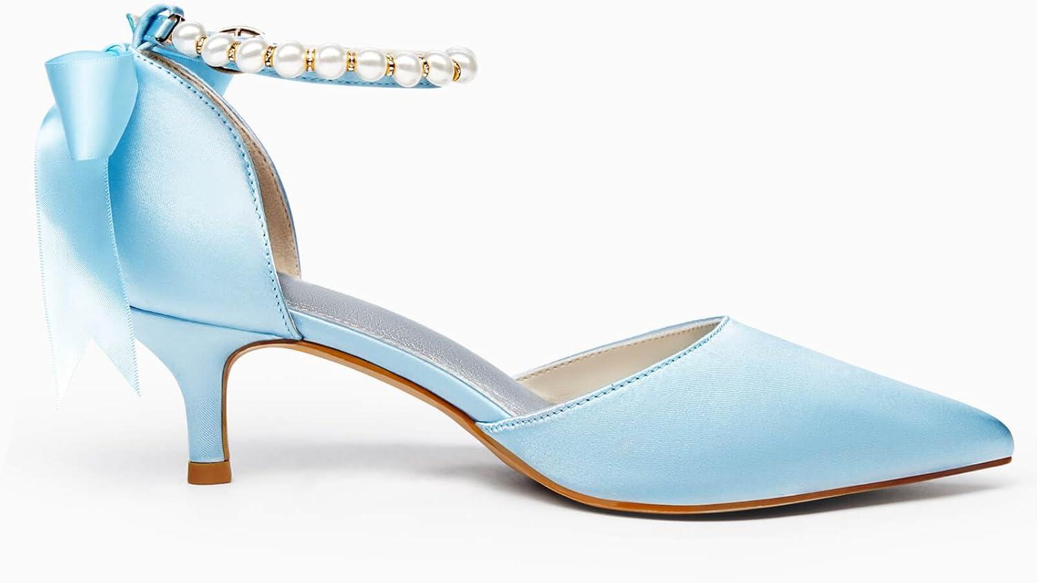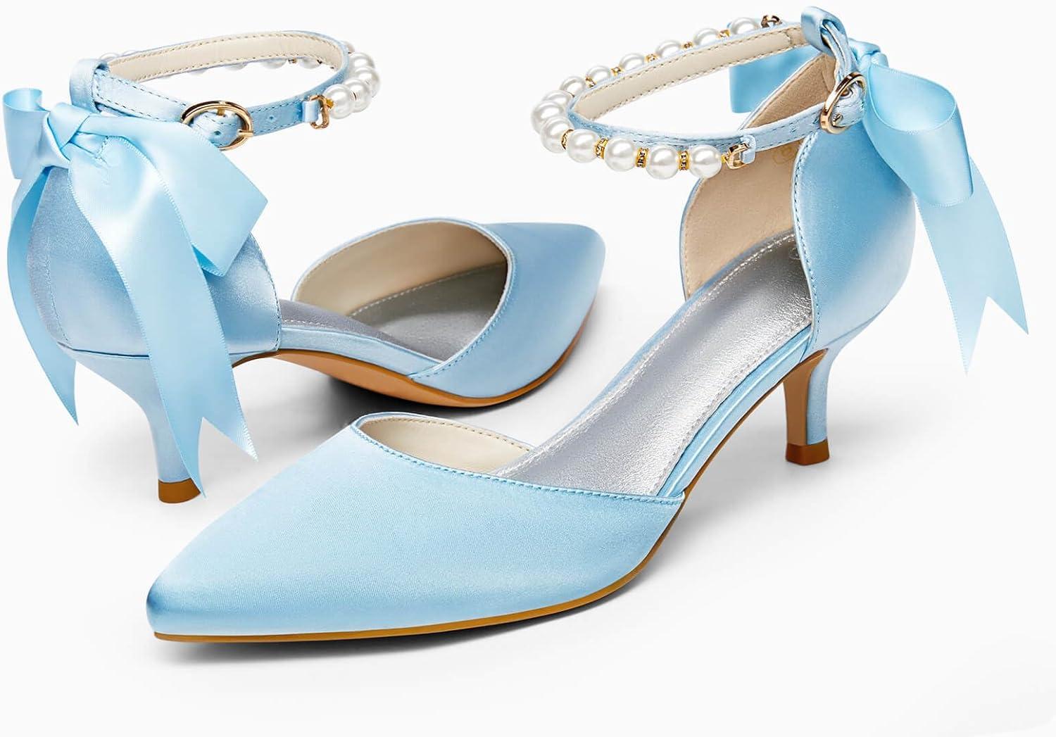 Coutgo Womens Pearl Ankle Strap Pumps Low Kitten Heel D’Orsay Satin Back Tieknot Heels Pointed Toe Wedding Party Dress Shoes(Sky Blue)