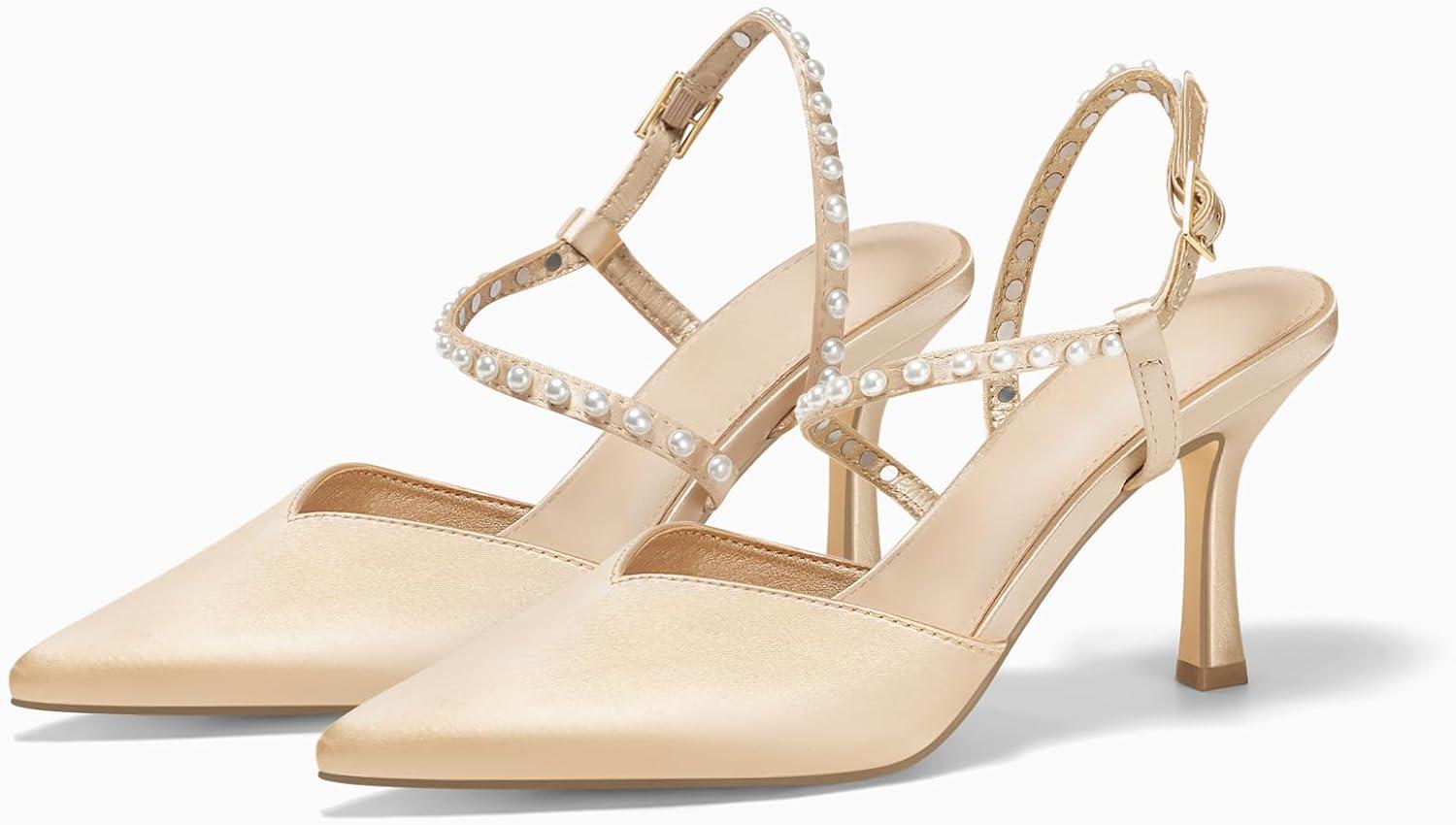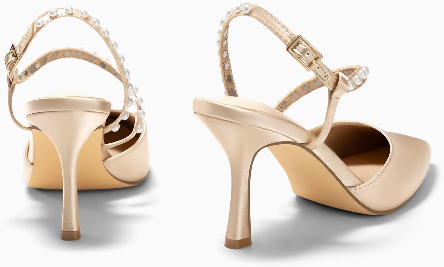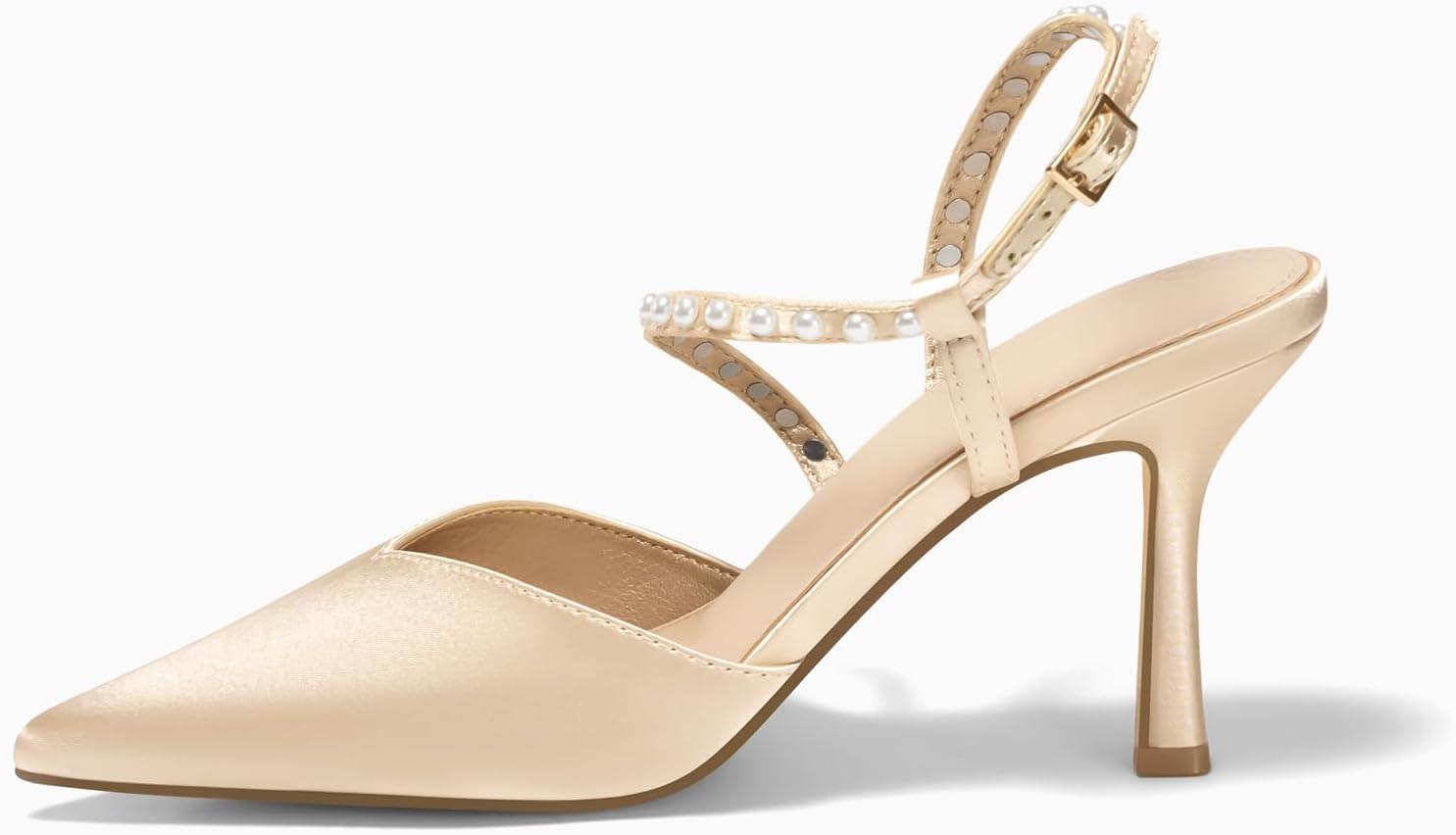 Coutgo Womens Pearl High Heels Closed Pointed Toe Wedding Bride Dress Shoes Ankle Strap Satin Pumps(Champagne Gold)