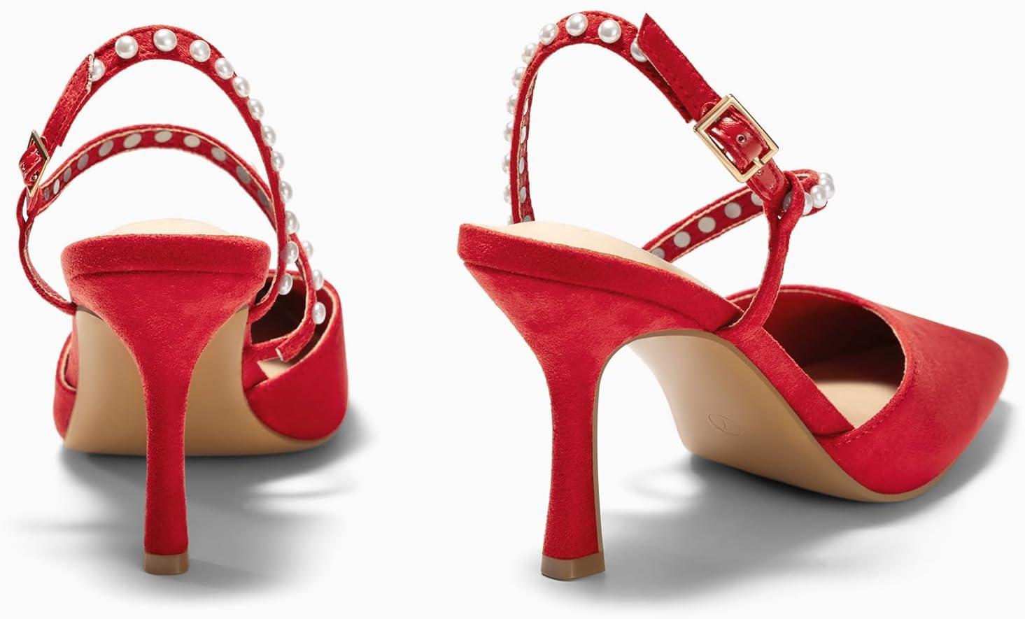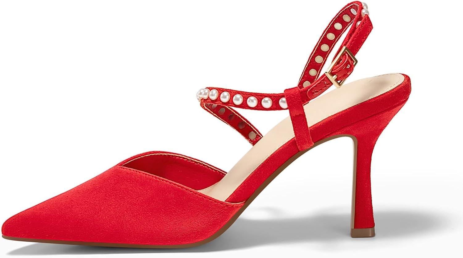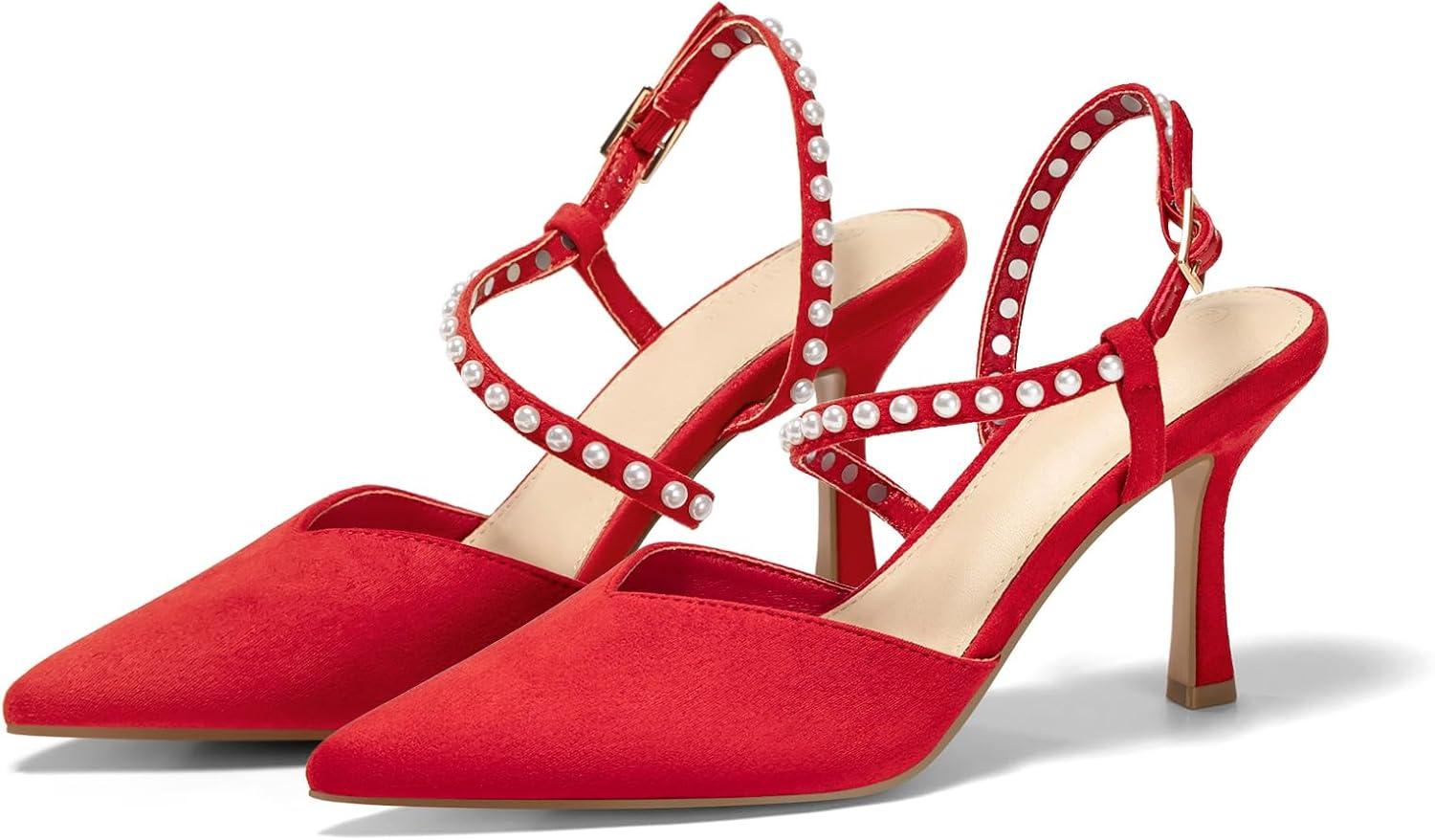 Coutgo Womens Pearl High Heels Closed Pointed Toe Wedding Bride Dress Shoes Ankle Strap Satin Pumps(Red)