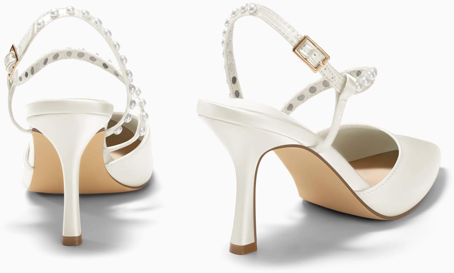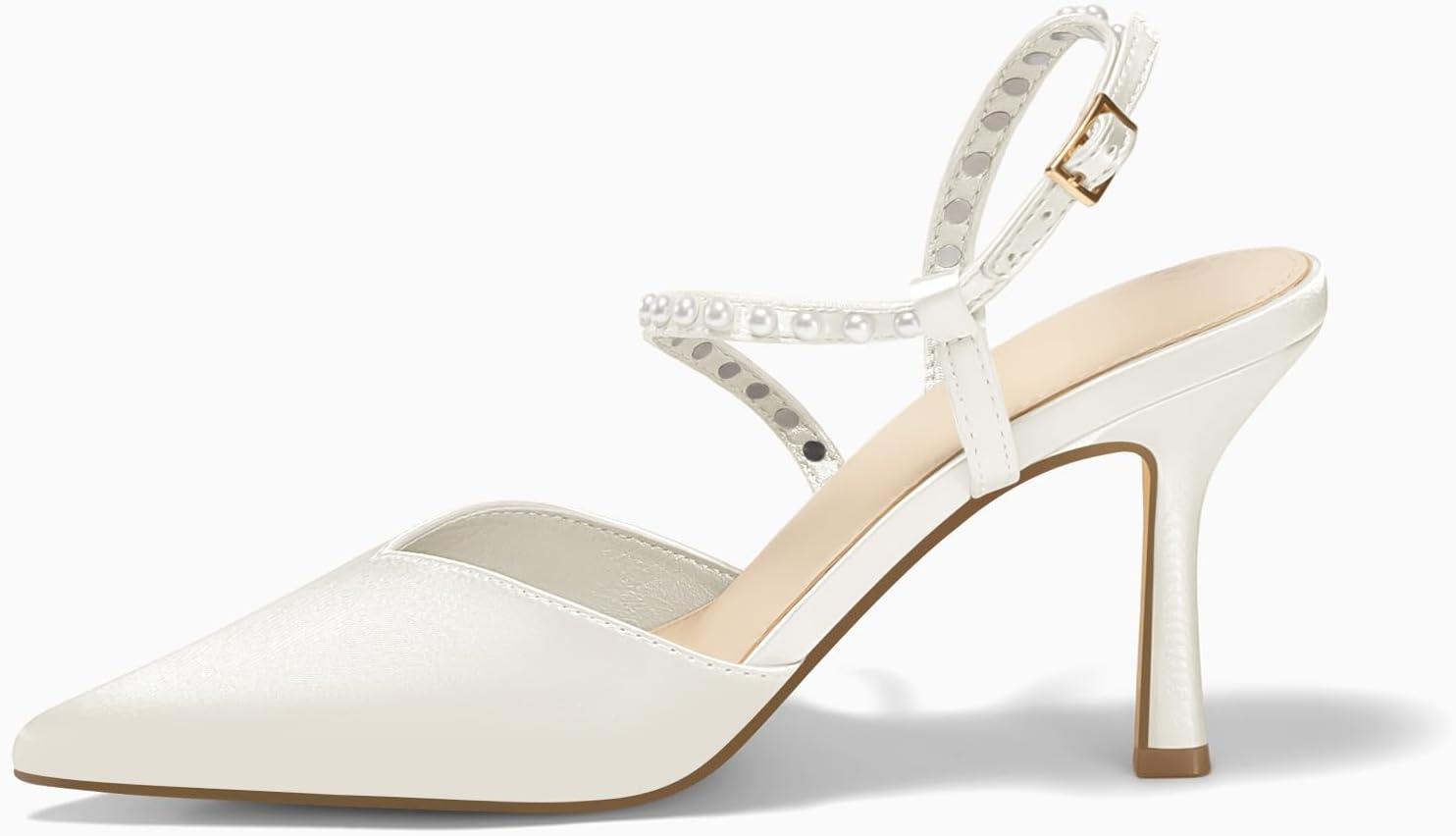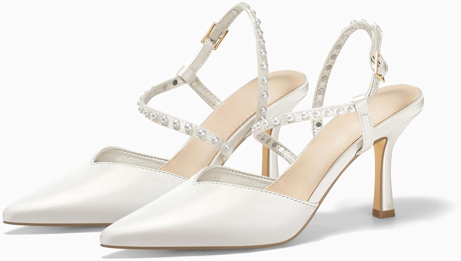 Coutgo Womens Pearl High Heels Closed Pointed Toe Wedding Bride Dress Shoes Ankle Strap Satin Pumps(White)