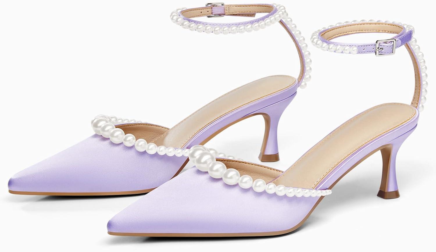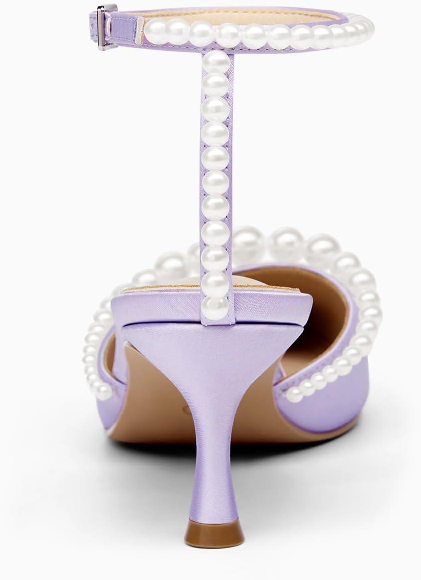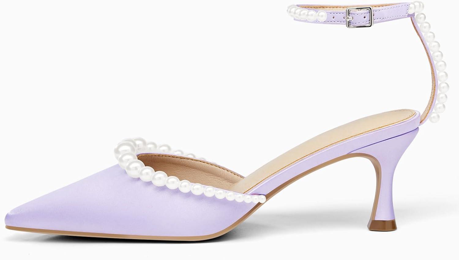 Coutgo Womens Pearl Kitten Heels Closed Pointed Toe Wedding Bride Dress Shoes Ankle Strap Satin Pumps(Light Purple)