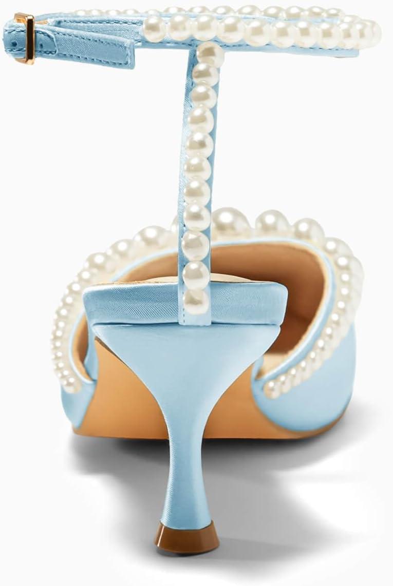 Coutgo Womens Pearl Kitten Heels Closed Pointed Toe Wedding Bride Dress Shoes Ankle Strap Satin Pumps(Sky Blue)