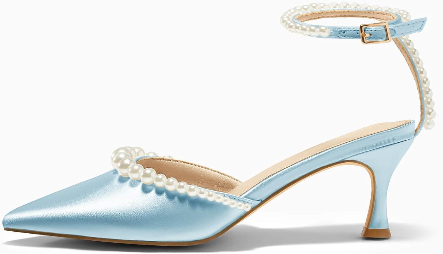 Get more for your money with our exclusive bundle deals on Coutgo Womens Pearl Kitten Heels Closed Pointed Toe Wedding Bride Dress Shoes Ankle Strap Satin Pumps(Sky Blue) and accessories.