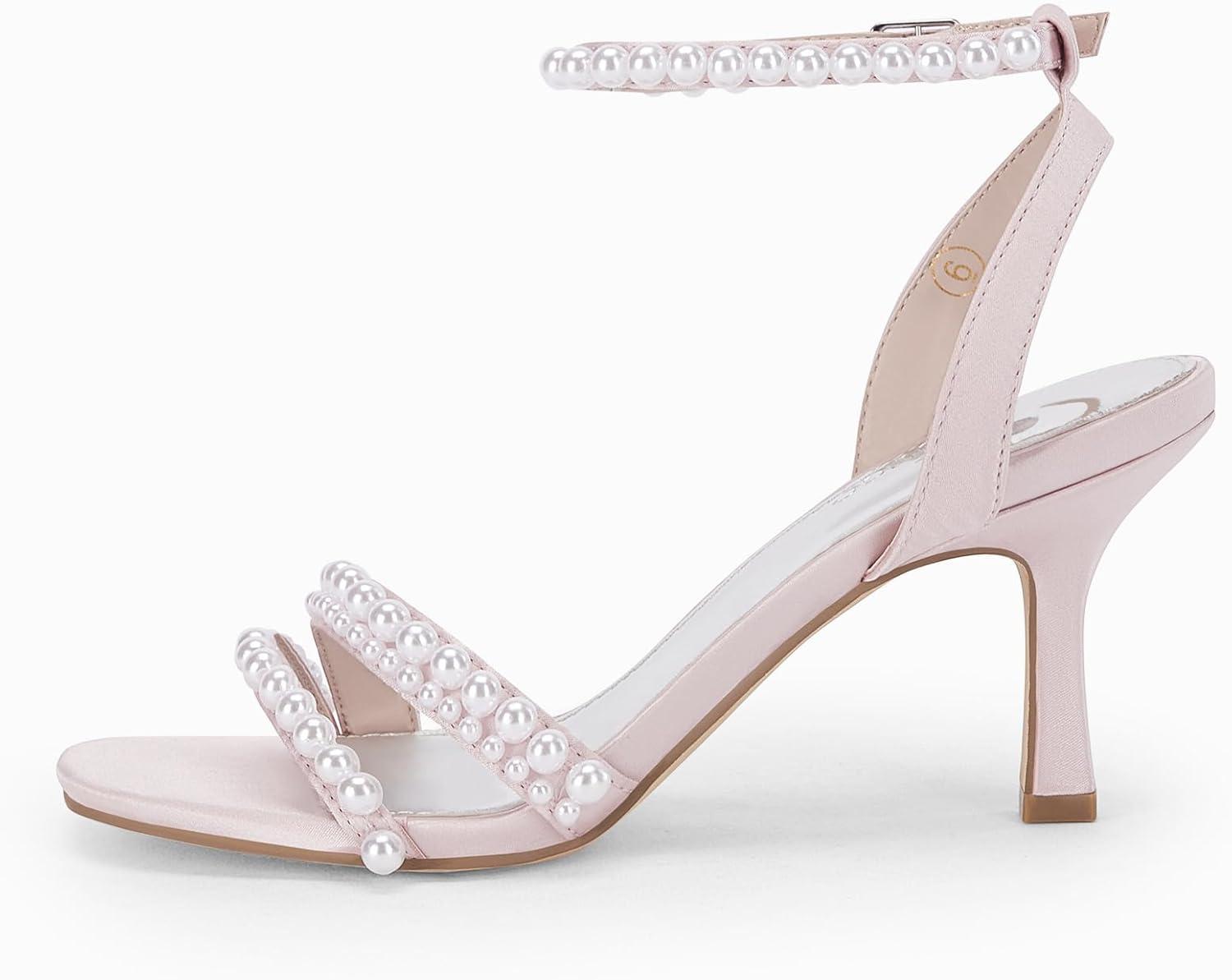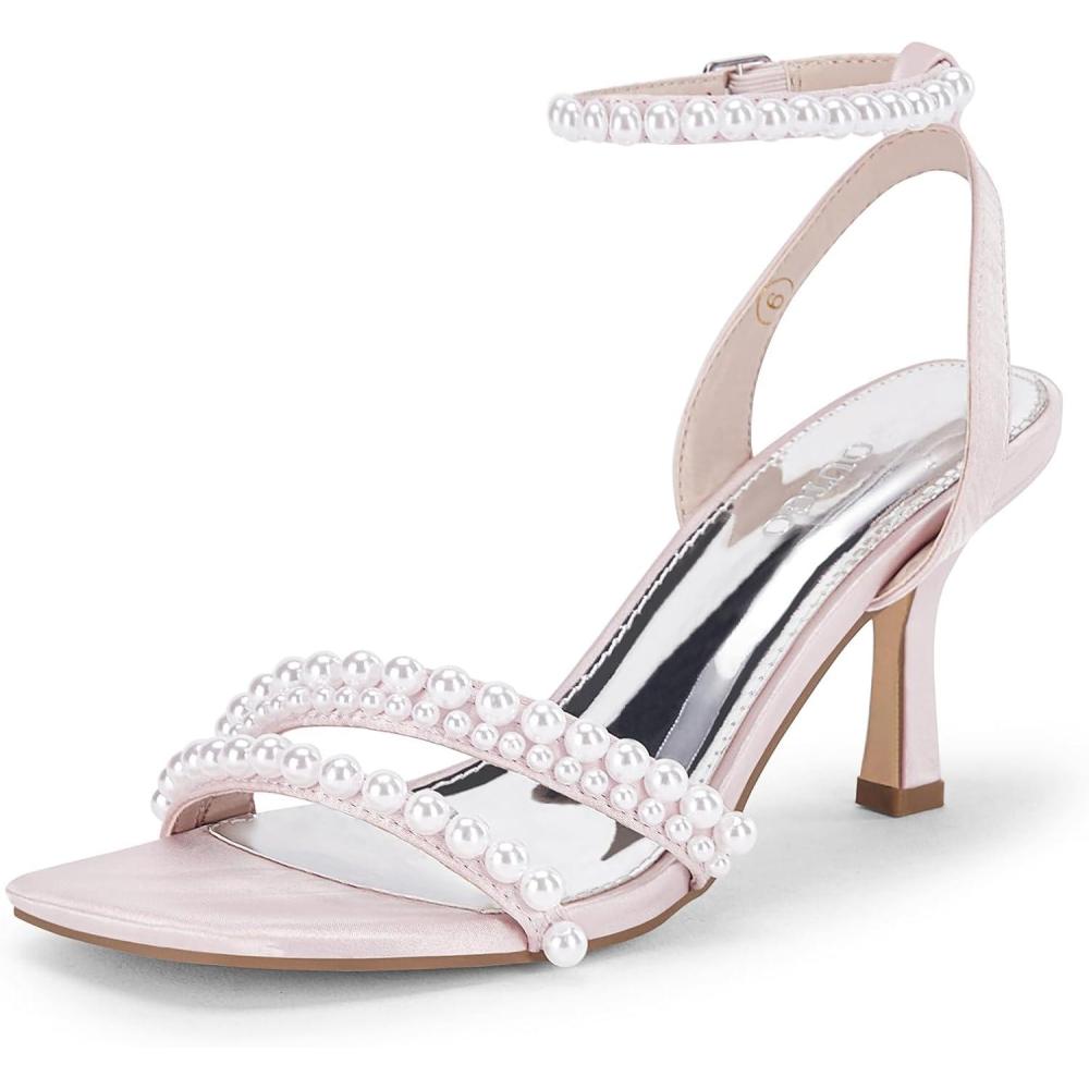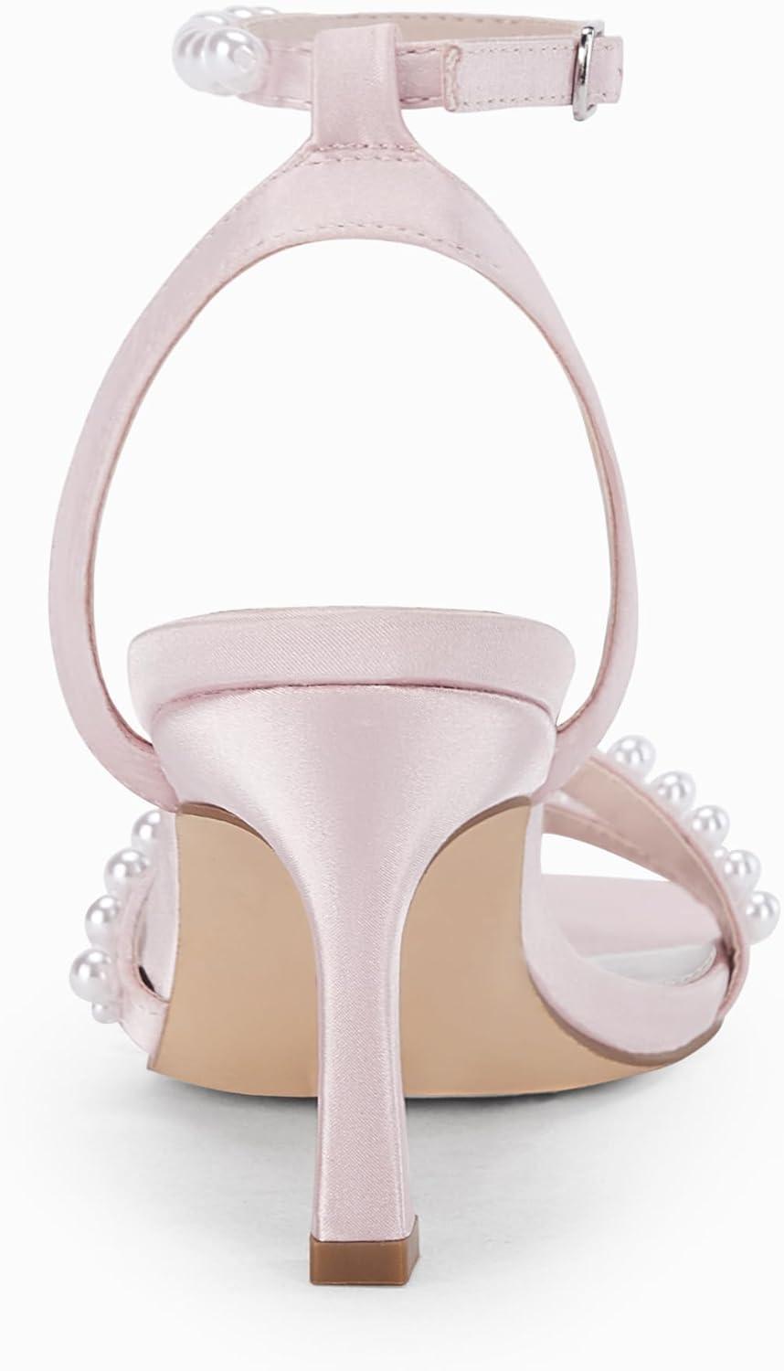 Coutgo Womens Pearl Kitten Heels Sandals Square Open Toe Dress Sandals Ankle Strap Satin Wedding Party Summer Sandals(Pink)