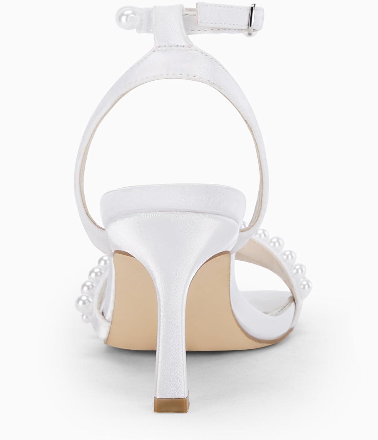 Coutgo Womens Pearl Kitten Heels Sandals Square Open Toe Dress Sandals Ankle Strap Satin Wedding Party Summer Sandals(White)