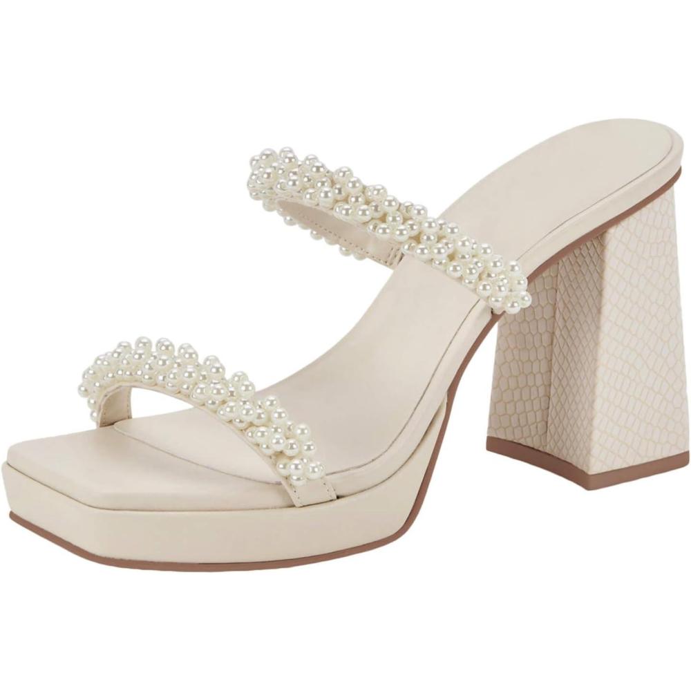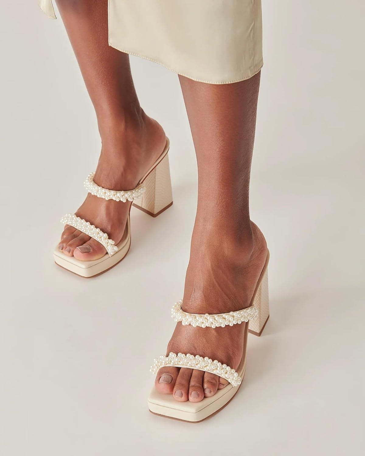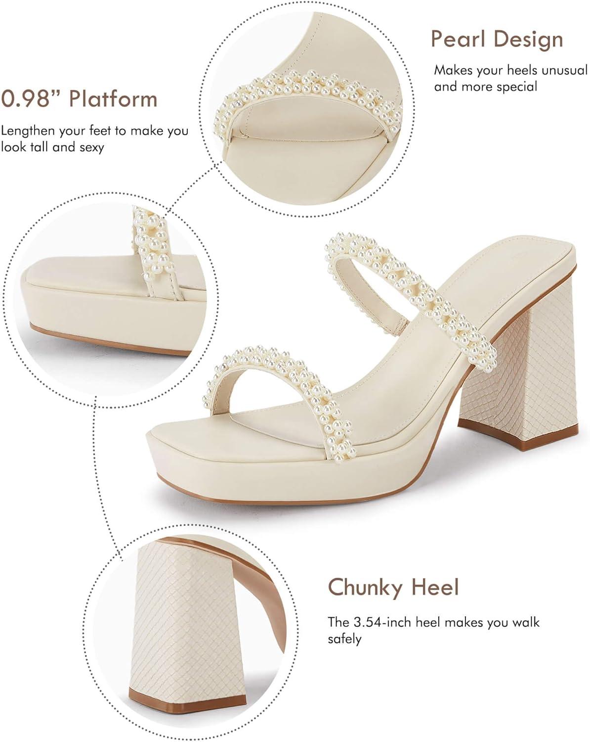 Coutgo Women’s Pearl Sandals Platform Chunky High Heels Square Open Toe Strappy Slip On Slides(Beige)