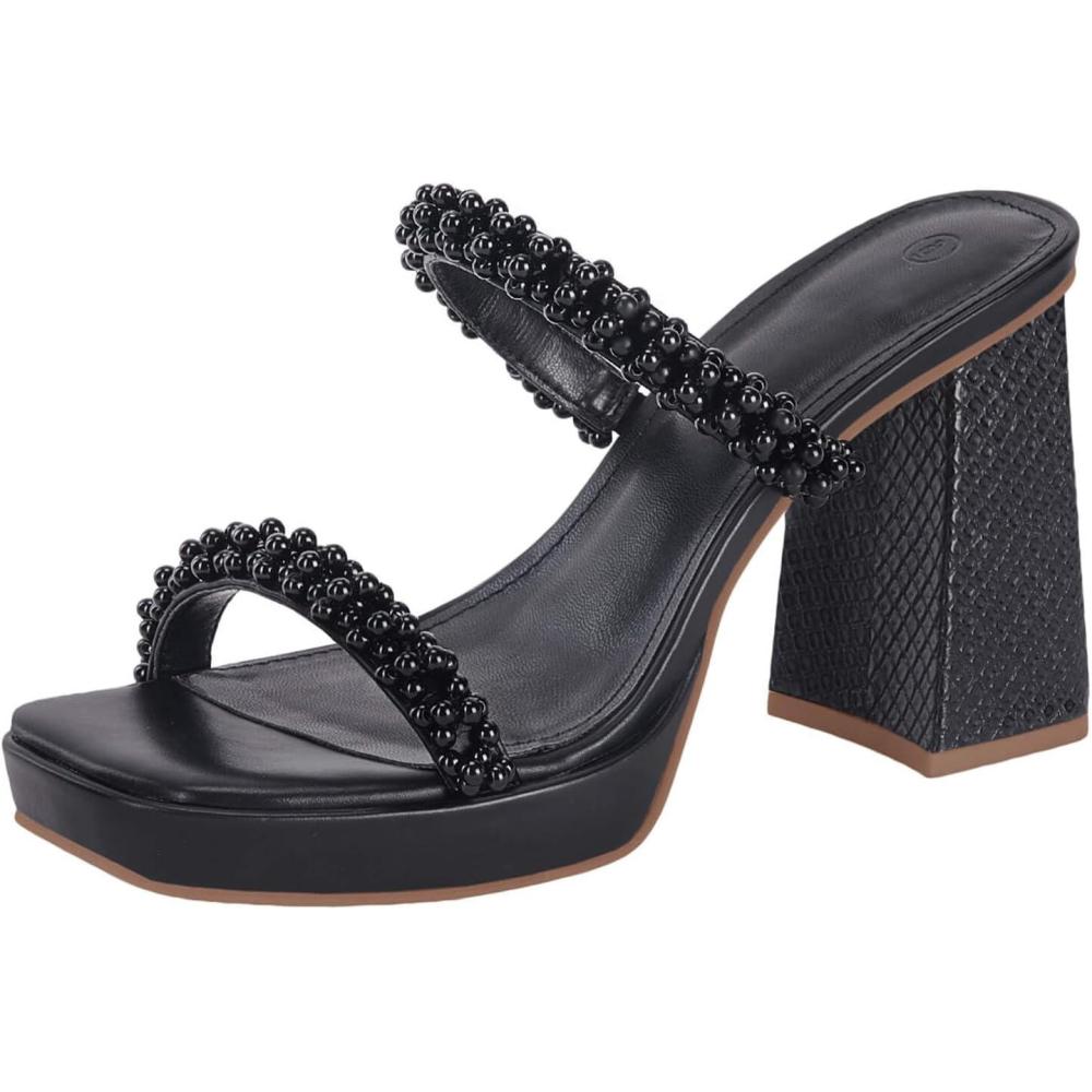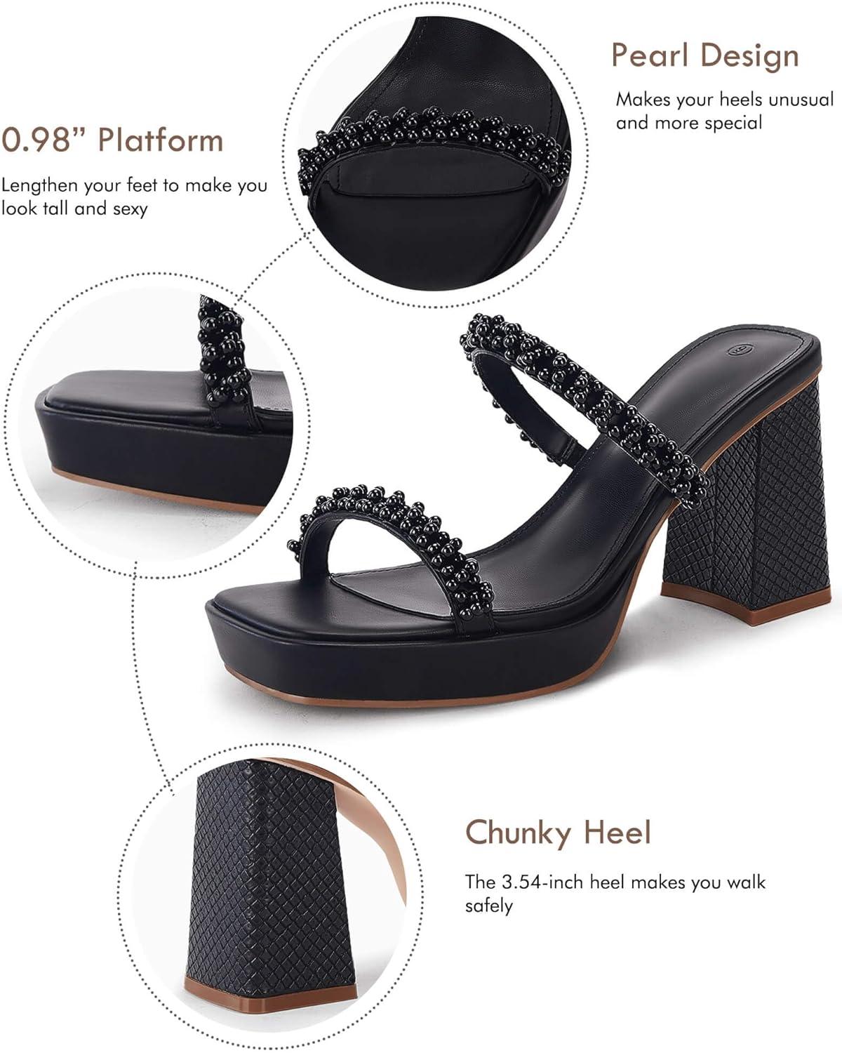 Coutgo Women’s Pearl Sandals Platform Chunky High Heels Square Open Toe Strappy Slip On Slides(Black)