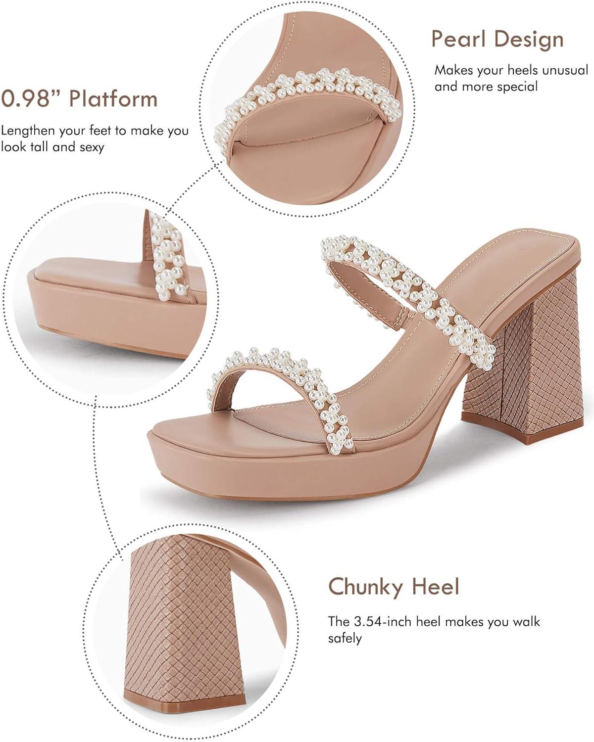 Coutgo Women’s Pearl Sandals Platform Chunky High Heels Square Open Toe Strappy Slip On Slides(Camel Beige)