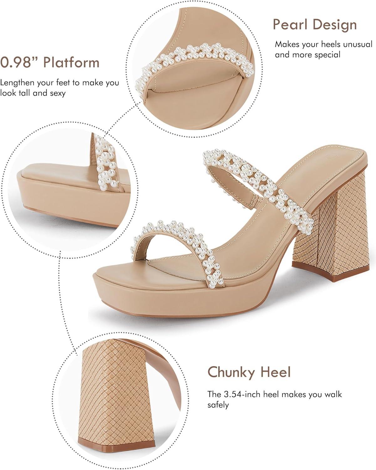 Coutgo Women’s Pearl Sandals Platform Chunky High Heels Square Open Toe Strappy Slip On Slides(Khaki)