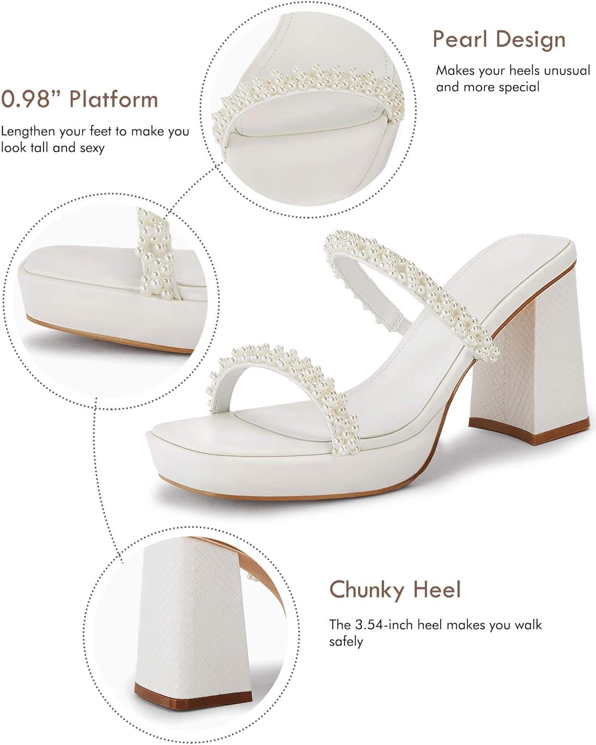 Coutgo Women’s Pearl Sandals Platform Chunky High Heels Square Open Toe Strappy Slip On Slides(White)