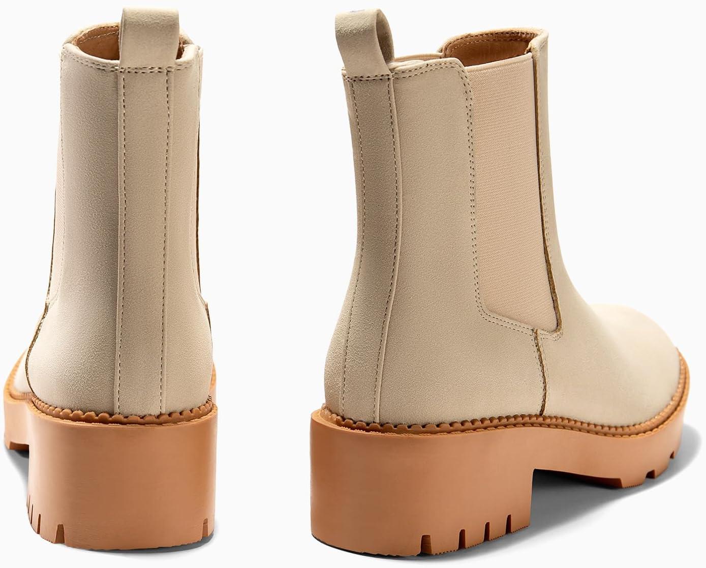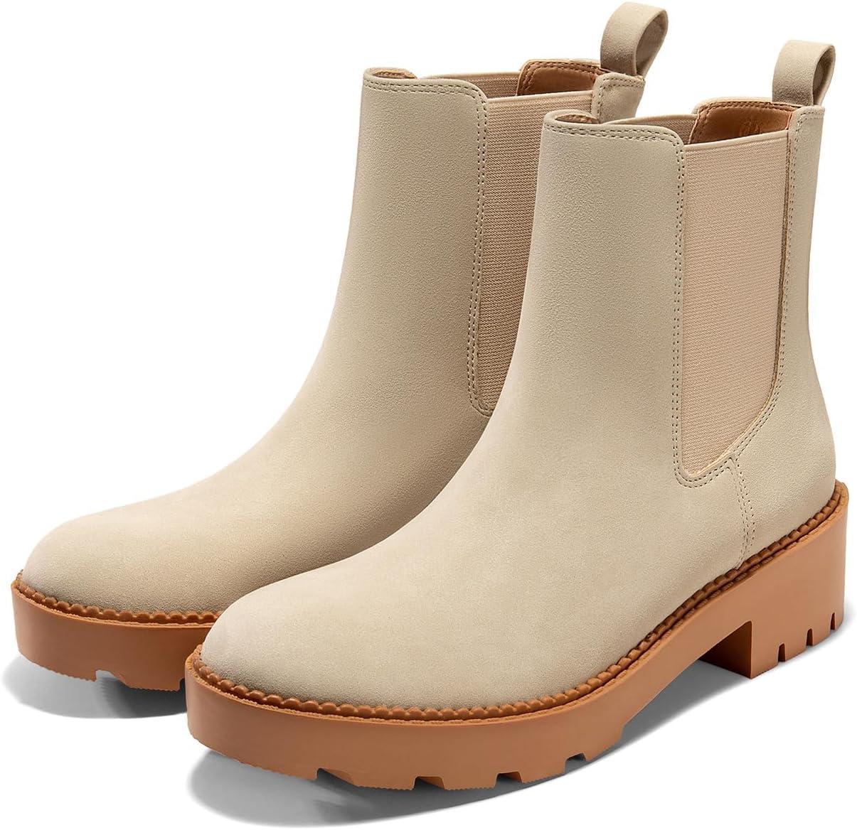Coutgo Womens Platform Chunky Low Heel Slip on Chelsea Boots Suede Elastic Ankle Boots(Beige)
