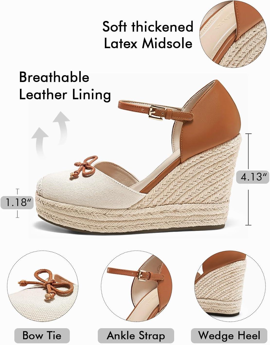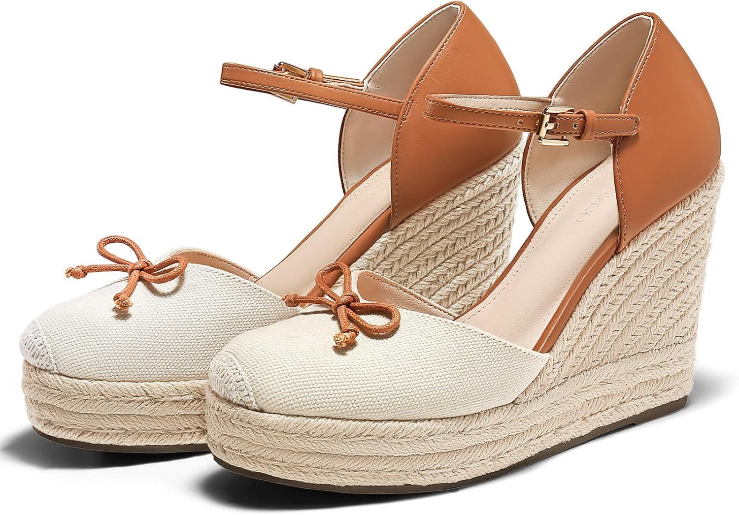 Coutgo Womens Platform Espadrilles Wedge Sandals Closed Cap Toe Bow Tie Ankle Buckle Strap Summer Dress Shoes(Nude)