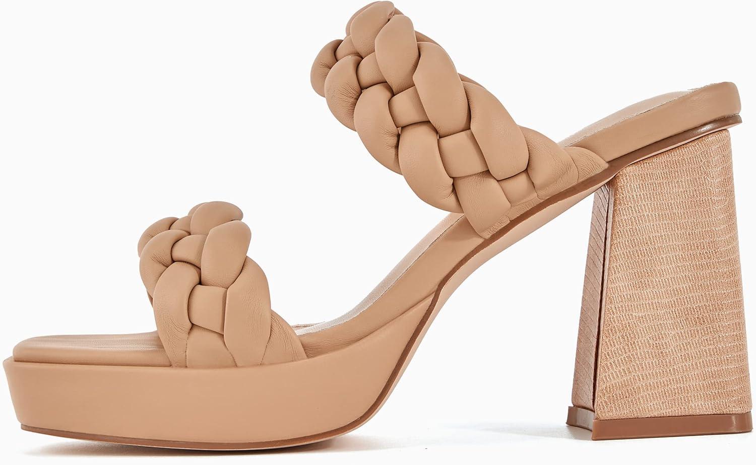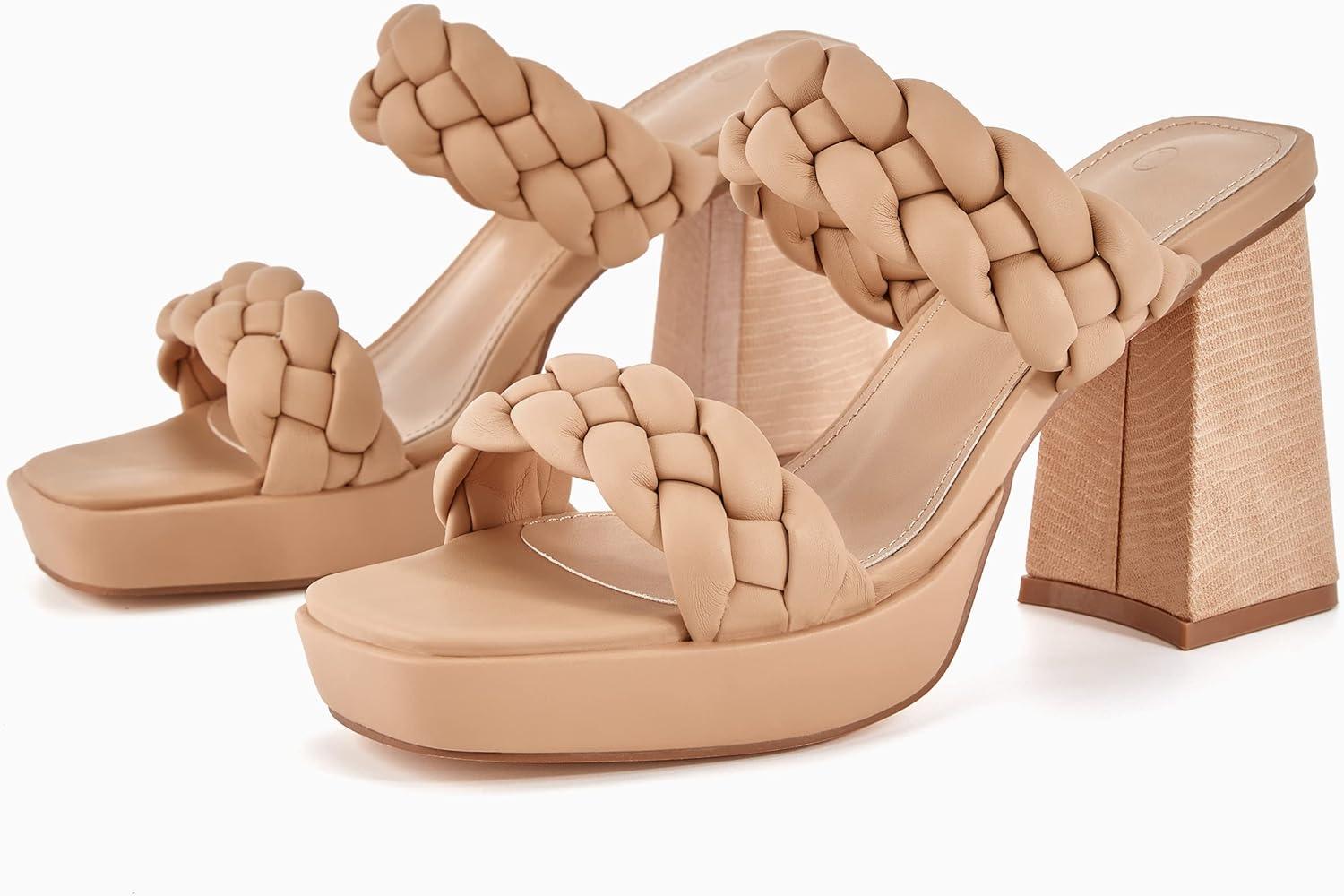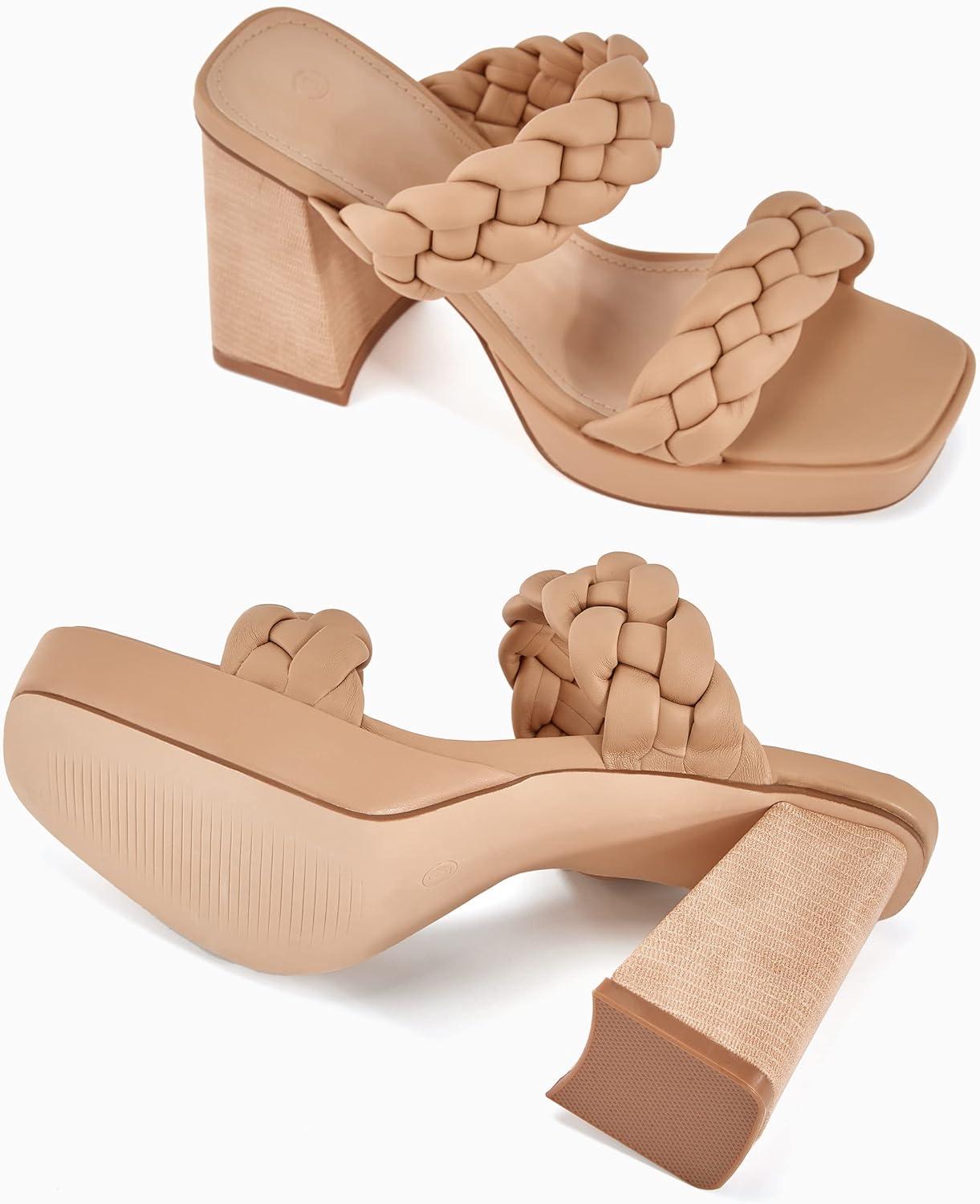 Coutgo Womens Platform Heels Chunky Heel Braided Heeled Sandals Slip on High Mules Party Summer Dress Shoes(Khaki)