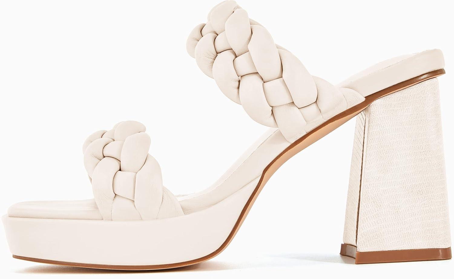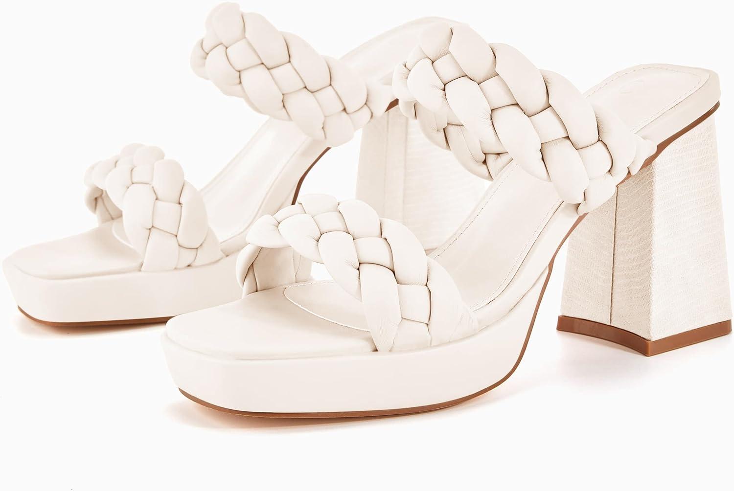 Coutgo Womens Platform Heels Chunky Heel Braided Heeled Sandals Slip on High Mules Party Summer Dress Shoes(White)