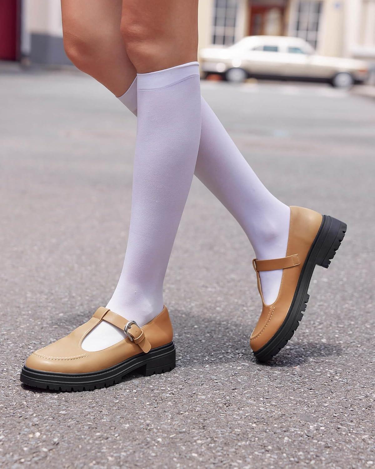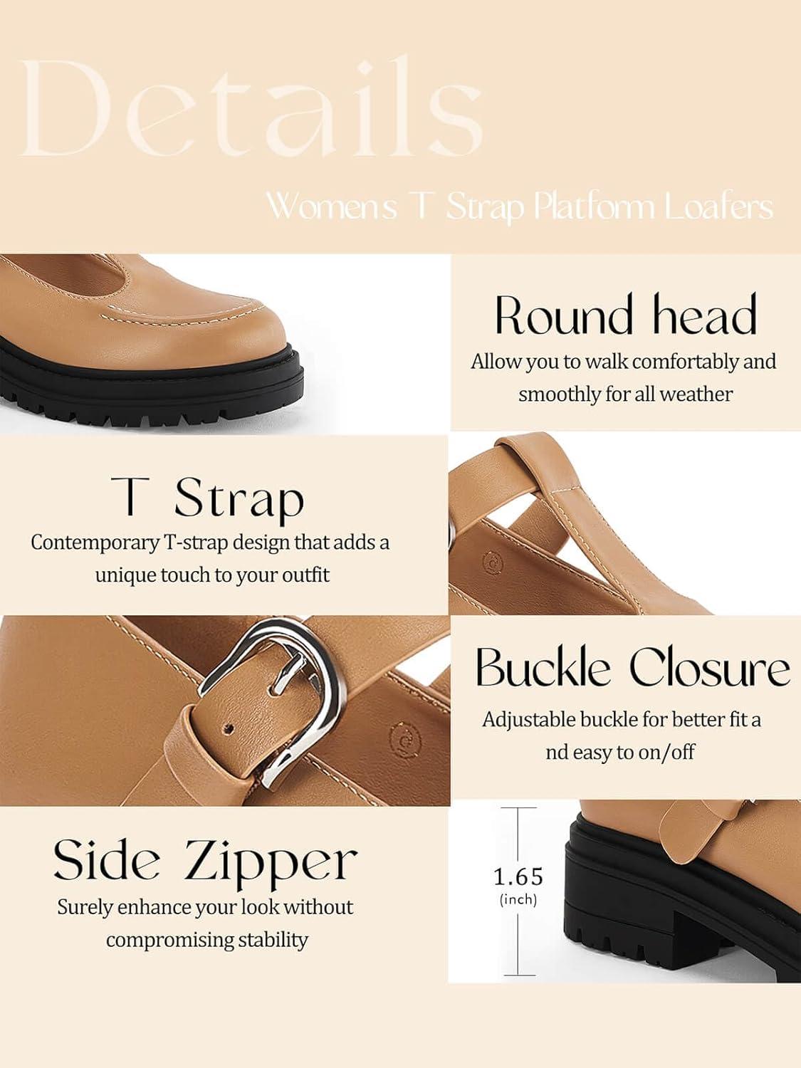 Coutgo Women’s Platform Loafers T Strap Chunky Low Heel Buckle Strap Mary Jane Comfortable Casual Office Shoes(Khaki)