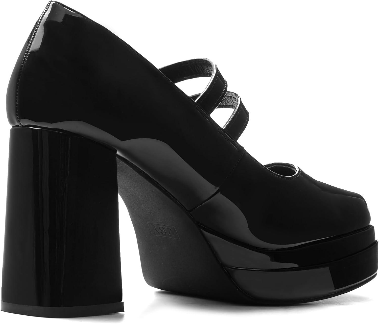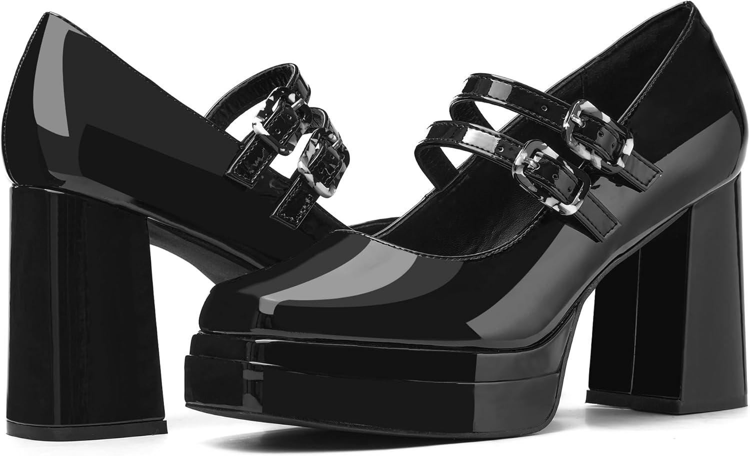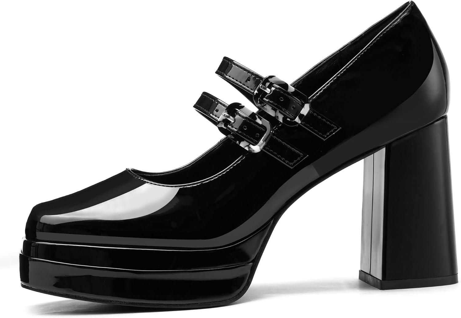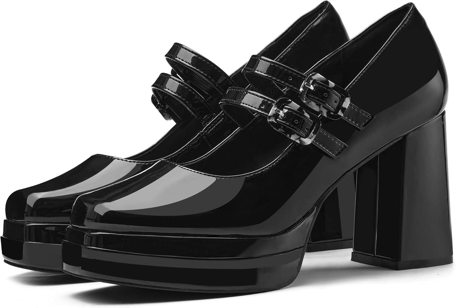 Coutgo Women’s Platform Mary Jane Pumps Two Strap Square Toe Chunky Block Heel Sandals Party Shoes(Black)