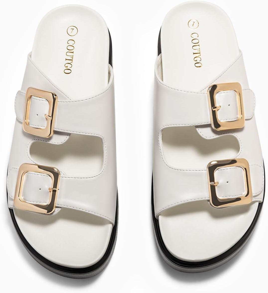 Coutgo Womens Platform Sandals Comfortable Arch Support Slip on Flat Slides Buckle Summer Beach Sandal Shoes(White)