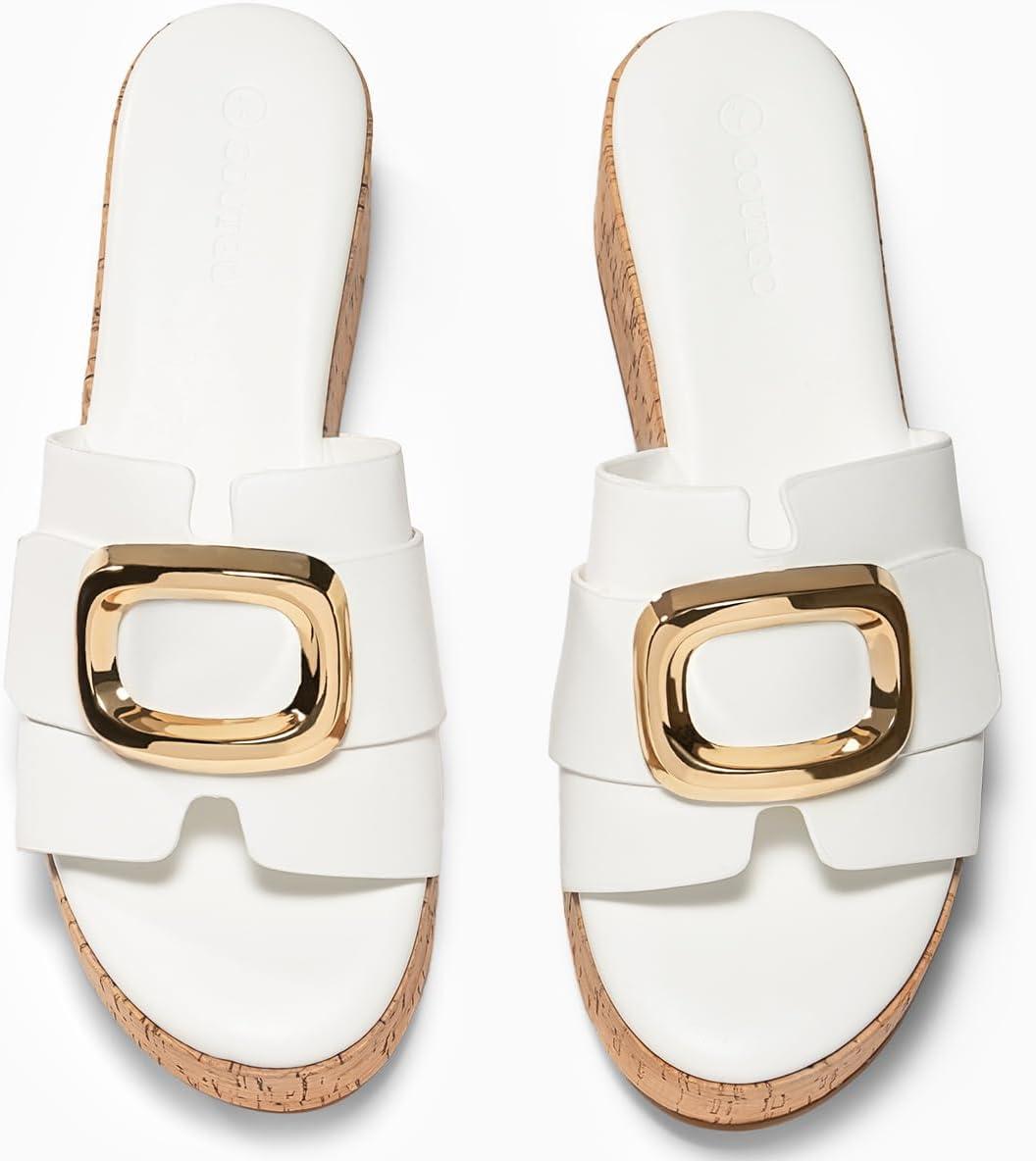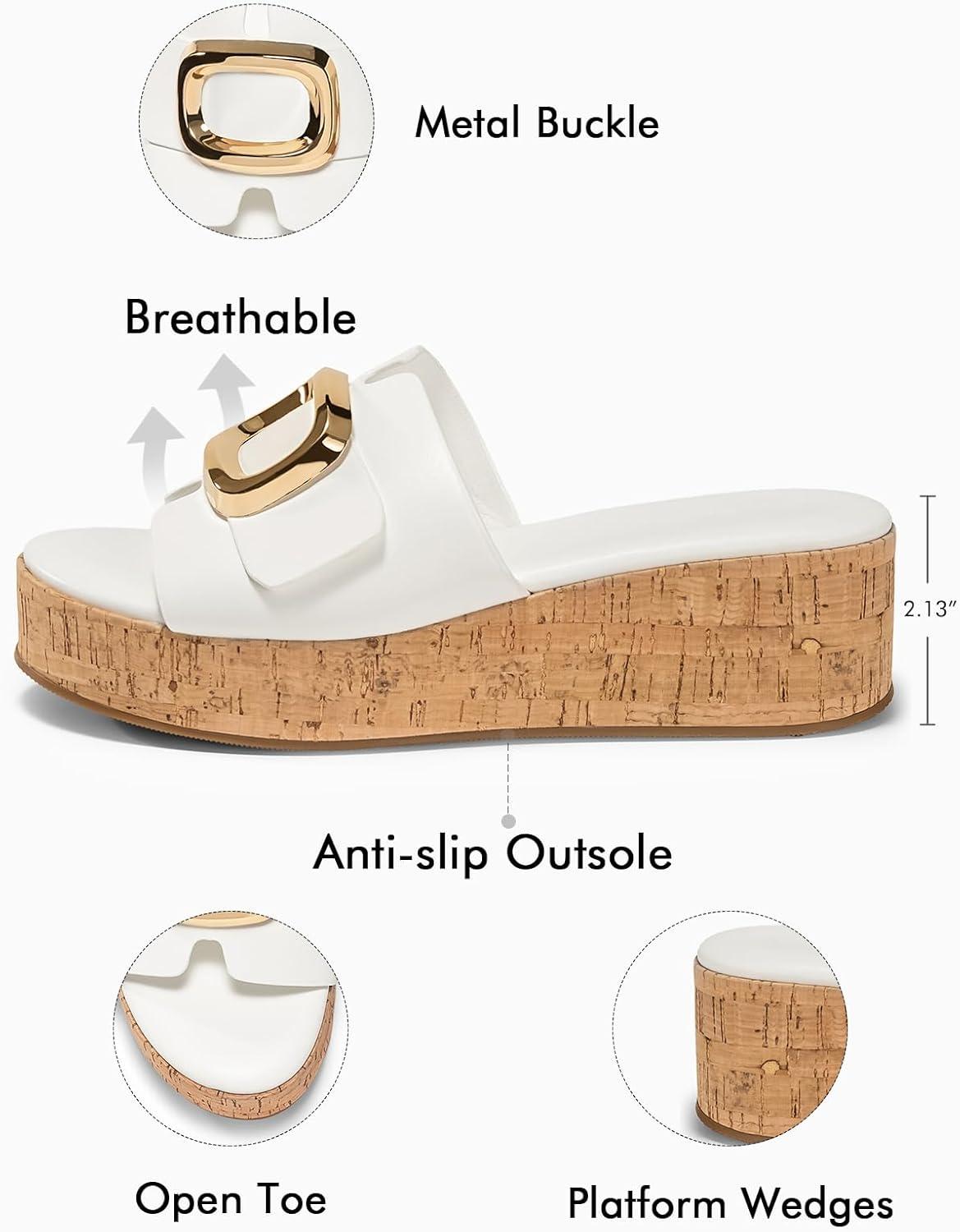 Coutgo Womens Platform Sandals Cork Beach Slip on Wedges Metal Buckle Slides Open Toe Summer Shoes(White)