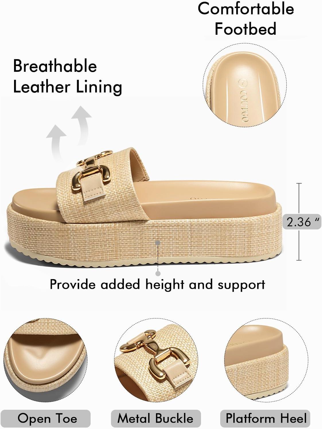 Coutgo Womens Platform Sandals Raffia Espadrilles Metal Chain Slip on Open Toe Cute Beach Slide Sandals(Beige)