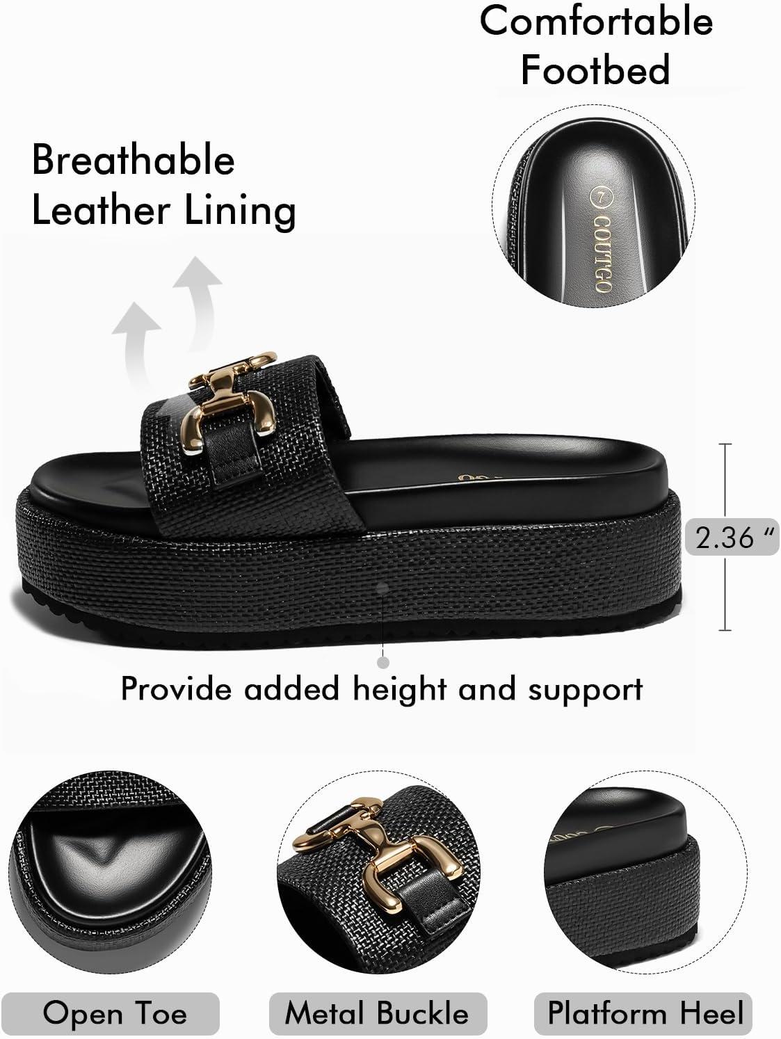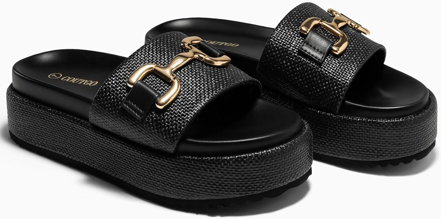 Coutgo Womens Platform Sandals Raffia Espadrilles Metal Chain Slip on Open Toe Cute Beach Slide Sandals(Black)
