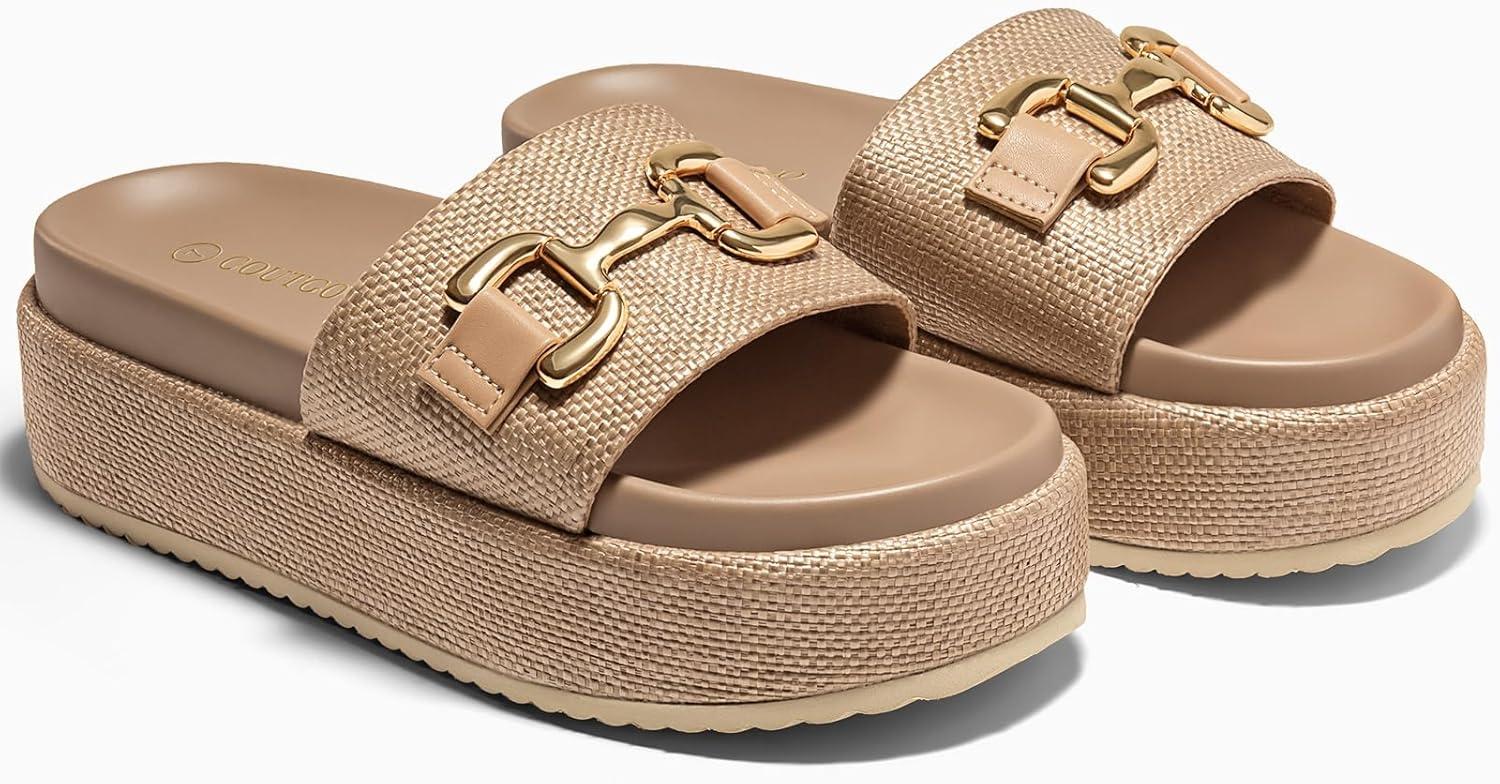 Get the Coutgo Womens Platform Sandals Raffia Espadrilles Metal Chain Slip on Open Toe Cute Beach Slide Sandals(Coffee) you’ve been eyeing at a discounted price during our seasonal sale event.