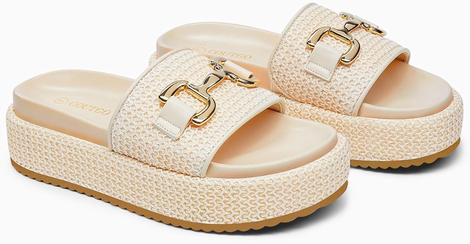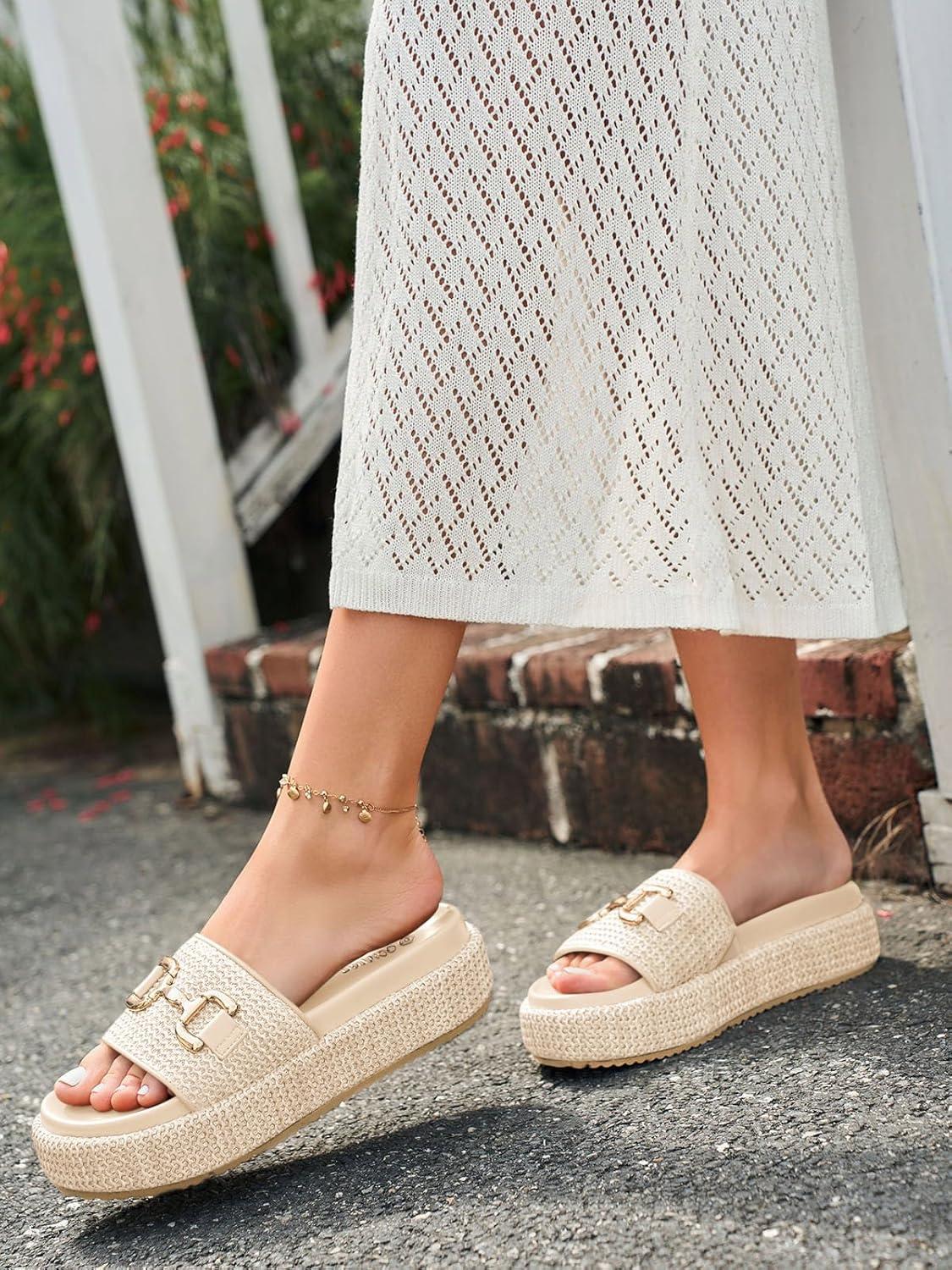 Coutgo Womens Platform Sandals Raffia Espadrilles Metal Chain Slip on Open Toe Cute Beach Slide Sandals(Cream White)