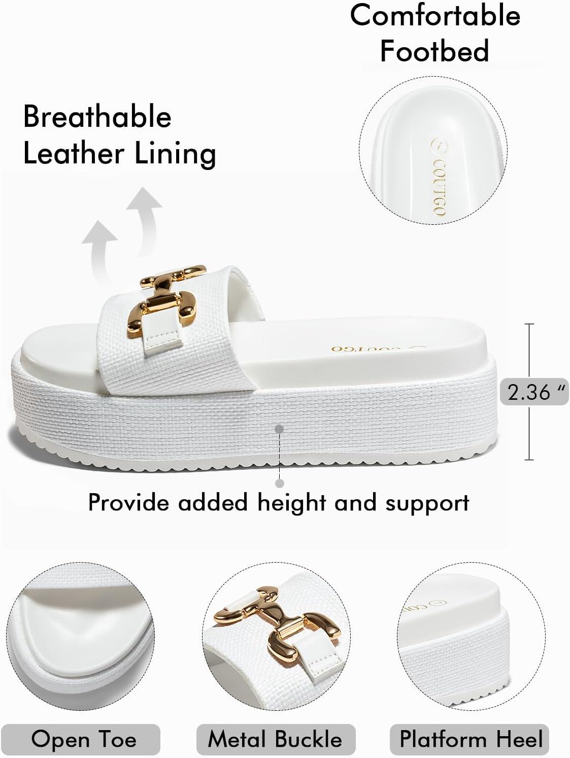 Coutgo Womens Platform Sandals Raffia Espadrilles Metal Chain Slip on Open Toe Cute Beach Slide Sandals(White)