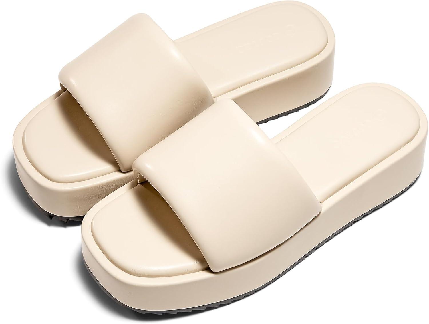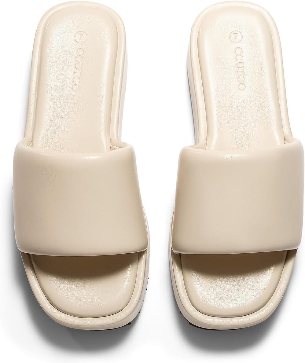 Coutgo Womens Platform Sandals Raffia Espadrilles Slip on Open Toe Cute Boho Summer Beach Slide Sandals(Beige Pu)