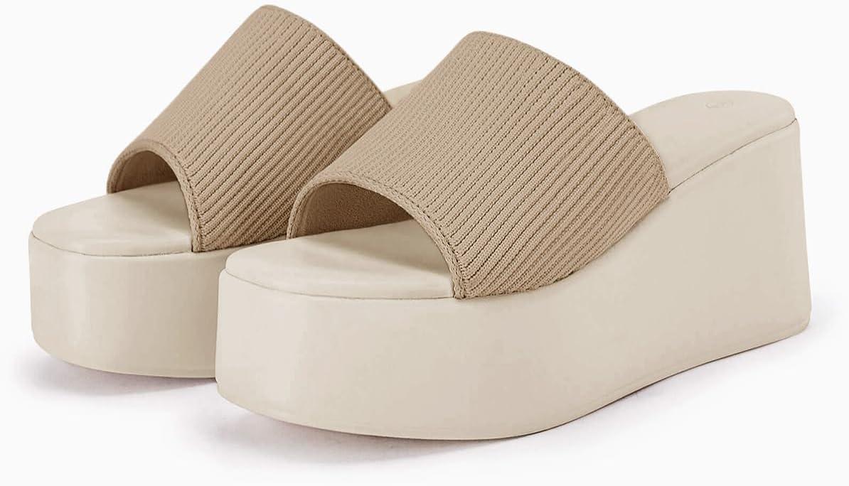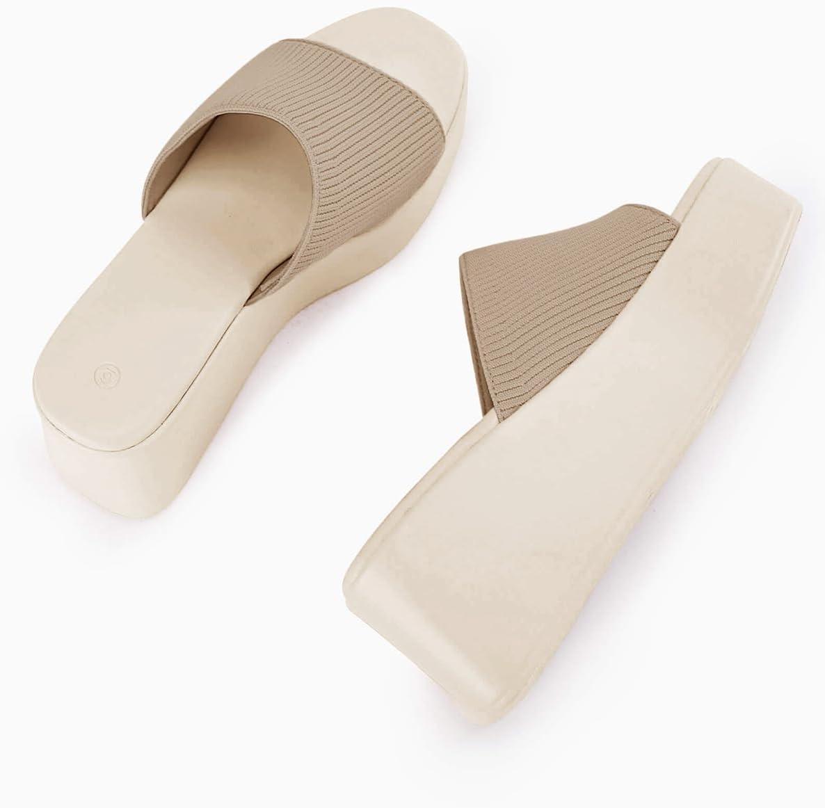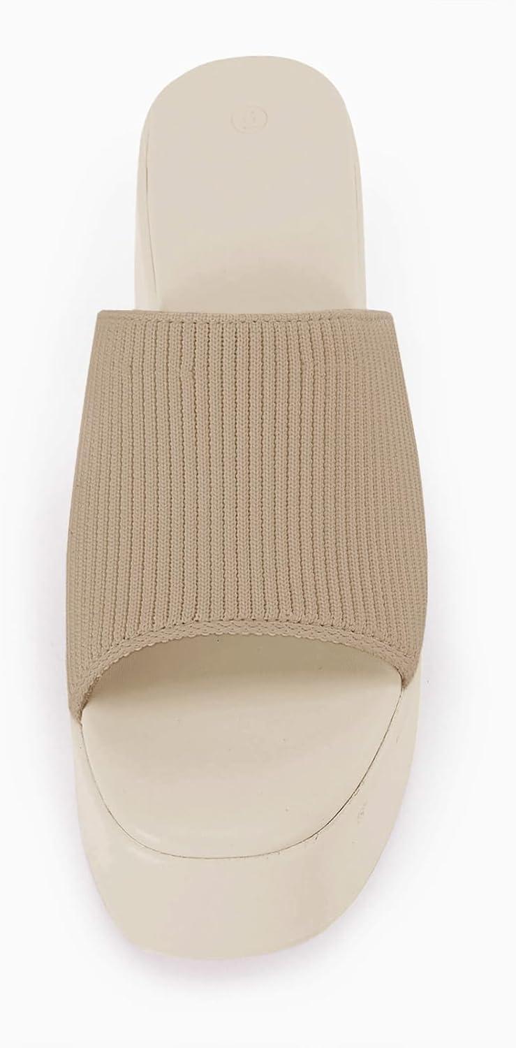 Coutgo Womens Platform Slides Sandals Square Open Toe Slip On Elastic Band Casual Lightweight Wedge Shoes(Light Khaki)