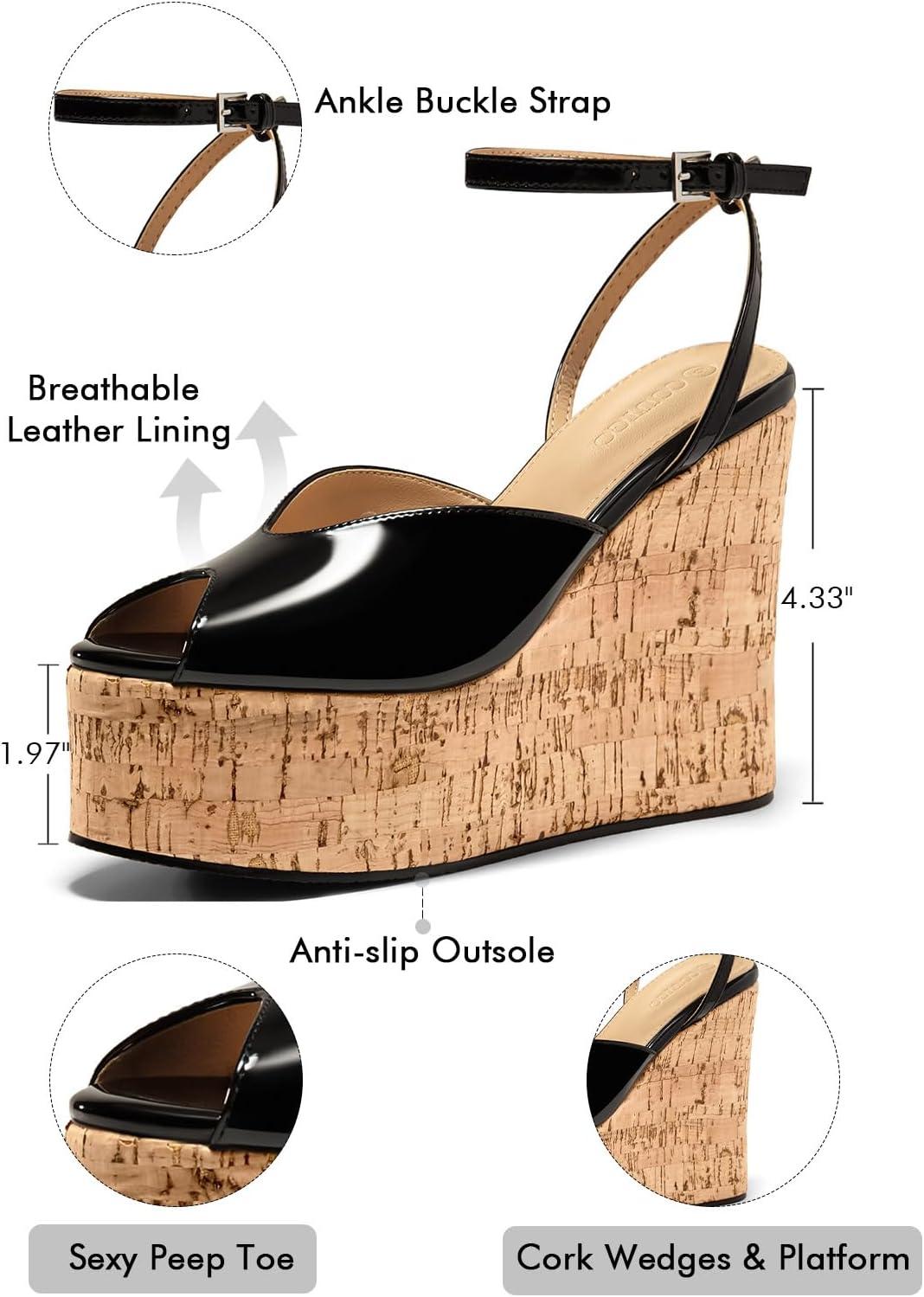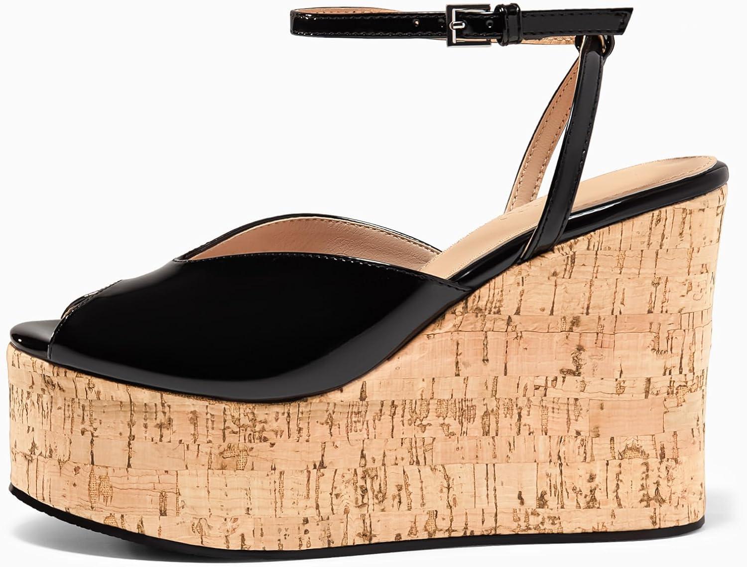 Coutgo Womens Platform Wedge Sandals Cork Dressy Peep Toe Ankle Buckle Strap High Heels Summer Shoes(Black)