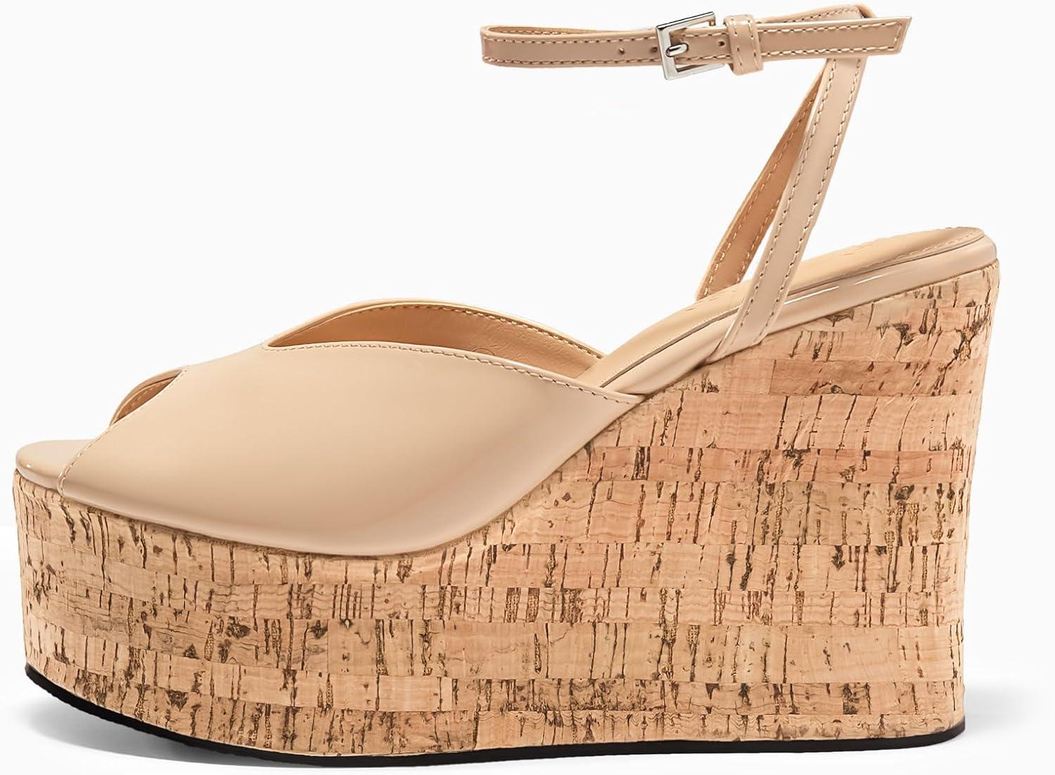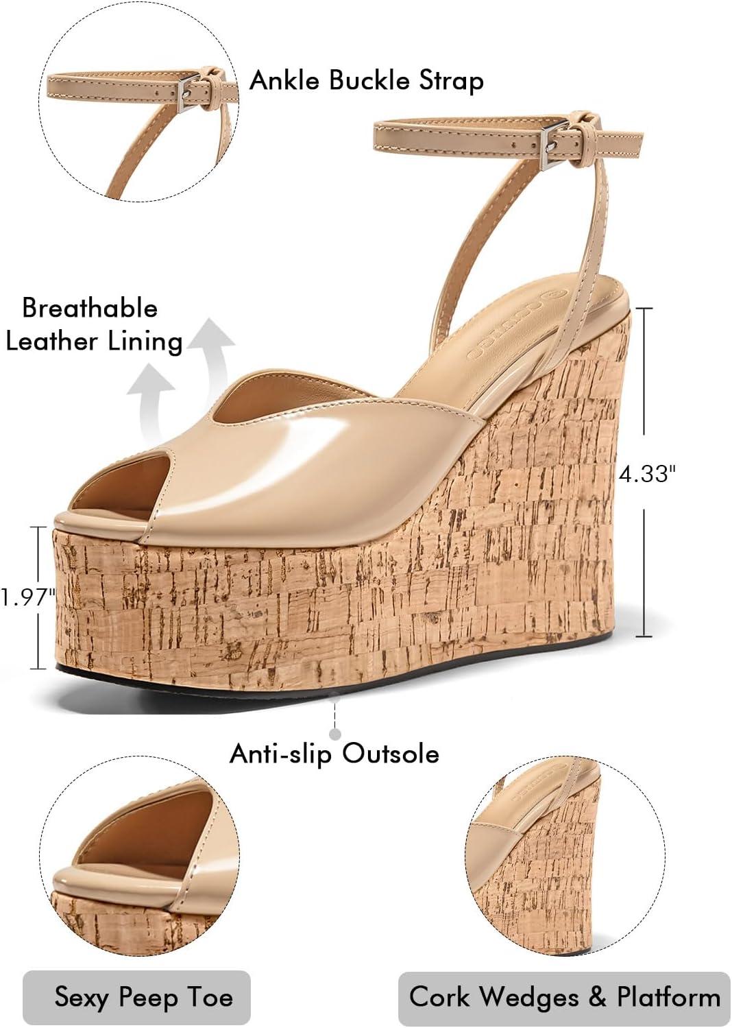 Coutgo Womens Platform Wedge Sandals Cork Dressy Peep Toe Ankle Buckle Strap High Heels Summer Shoes(Khaki)