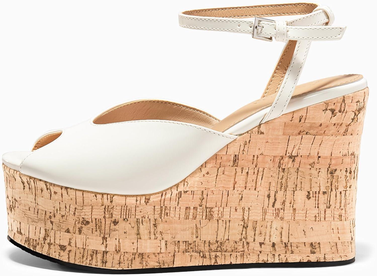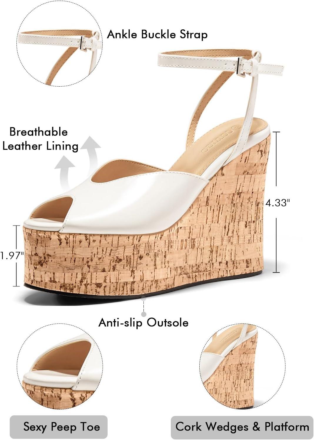 Coutgo Womens Platform Wedge Sandals Cork Dressy Peep Toe Ankle Buckle Strap High Heels Summer Shoes(White)