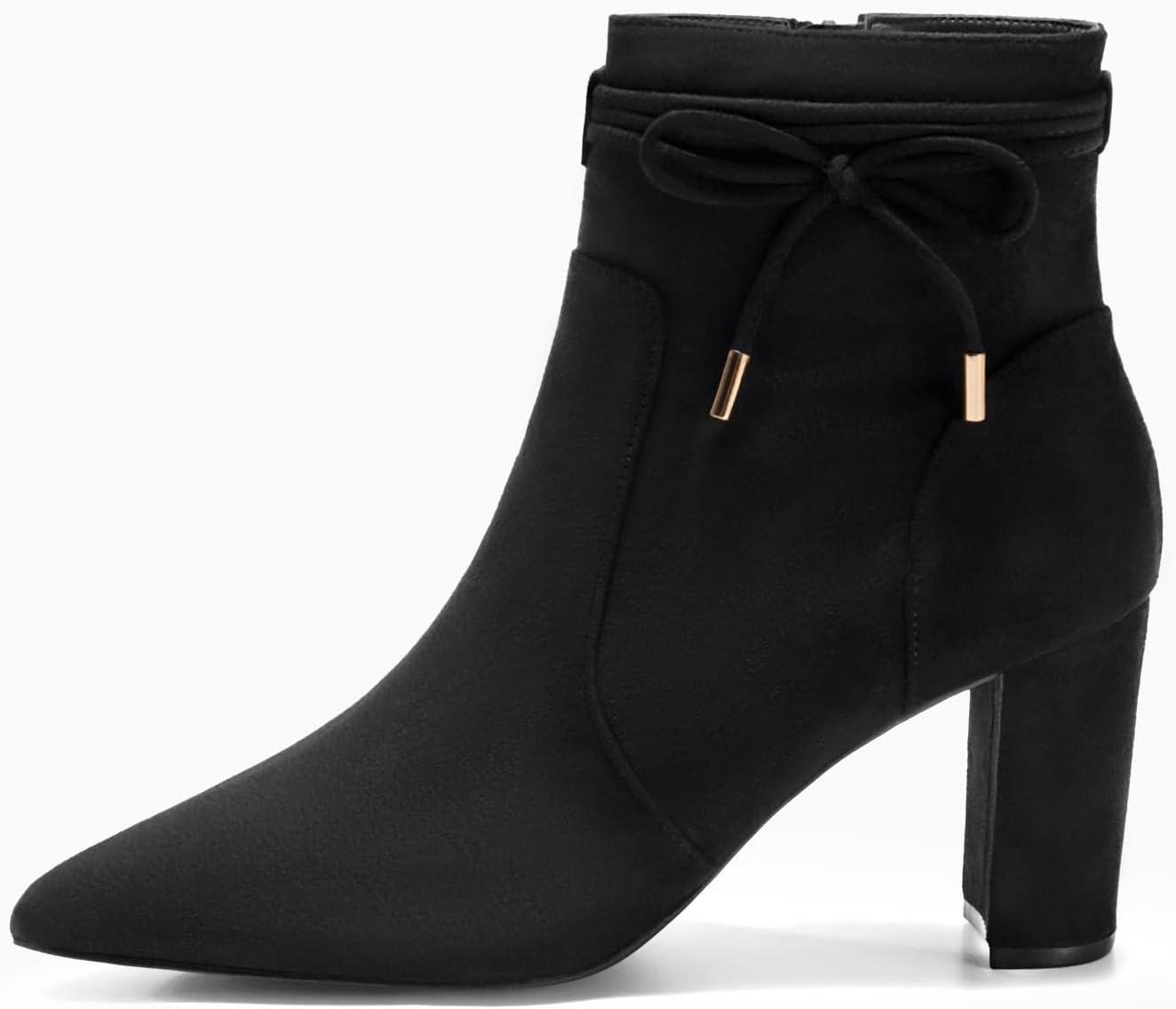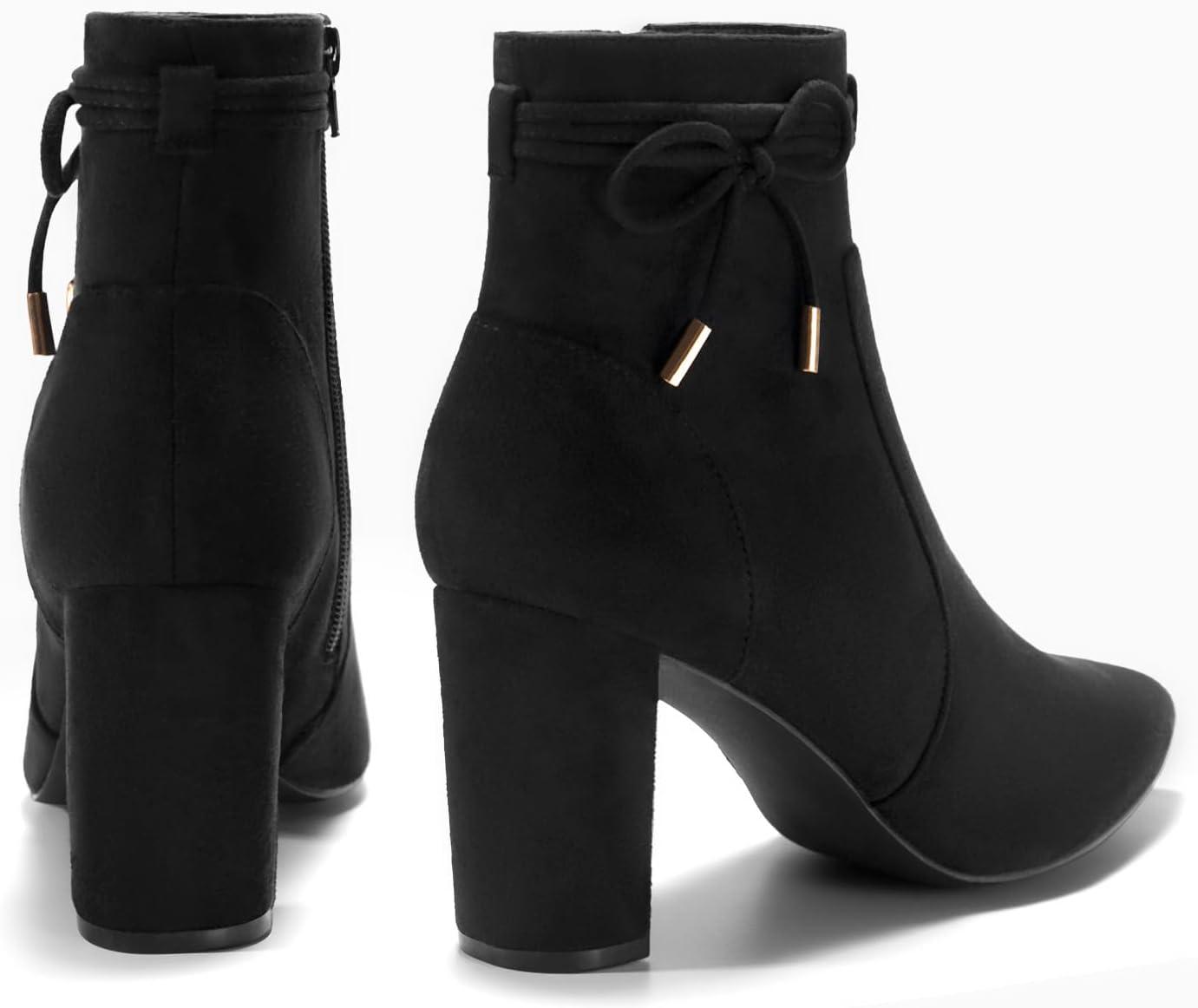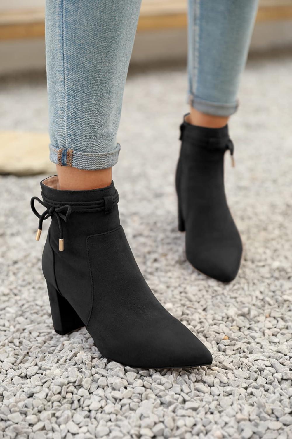 Coutgo Womens Pointed Toe Ankle Boots Chunky Block Heel Tie Knot Side Zipper Dressy Booties(Black)
