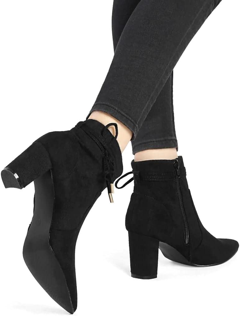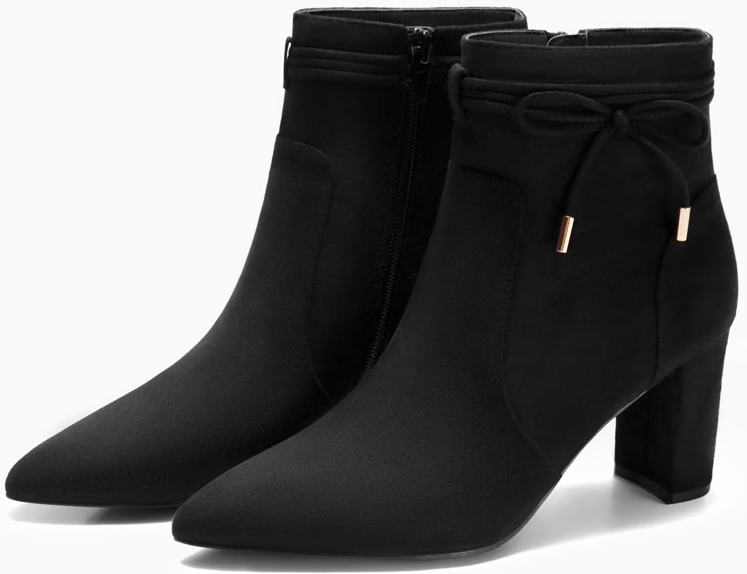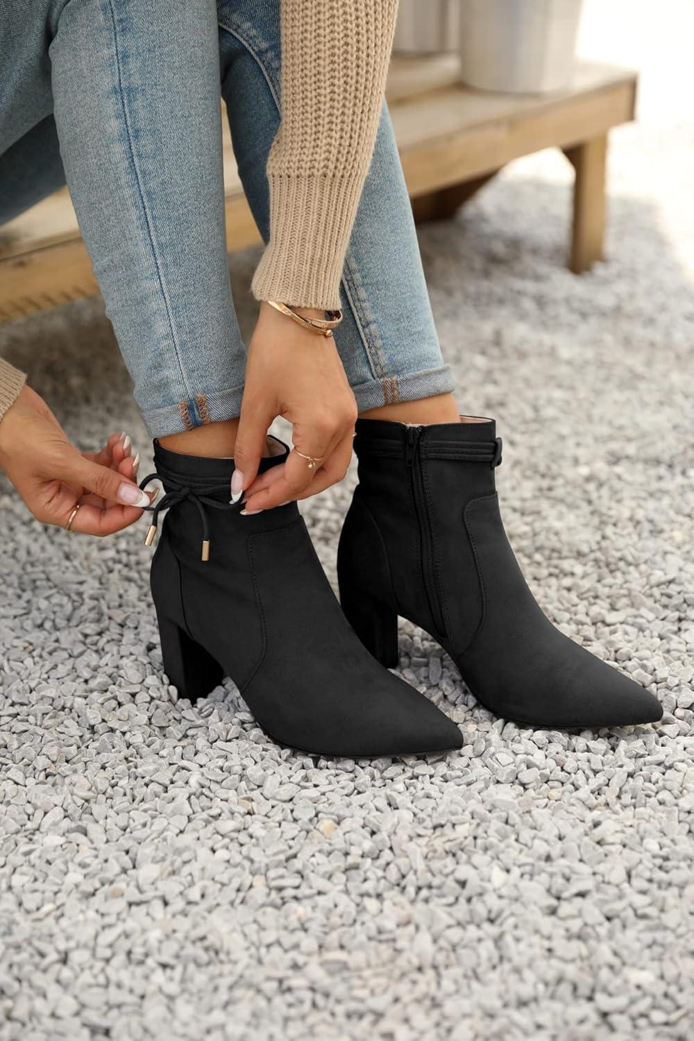 Coutgo Womens Pointed Toe Ankle Boots Chunky Block Heel Tie Knot Side Zipper Dressy Booties(Black)